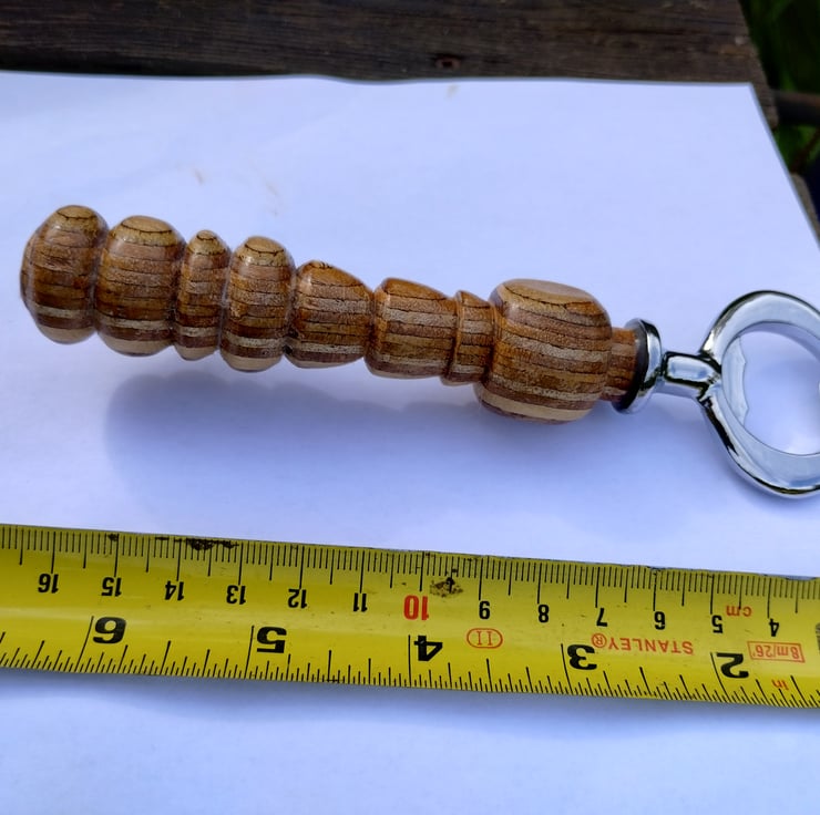 Turned wooden bottle opener with Steel end. When I first got a lathe I enjoyed turning some wood from my garden...I think this is apple or maybe pear, it has a lovely grain and has been lacquered then finished with wax, with the steel bottle opener epoxy resin glued in.... A few different types to choose from, some using plywood, all with different patterns and lengths.