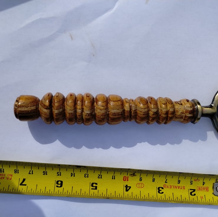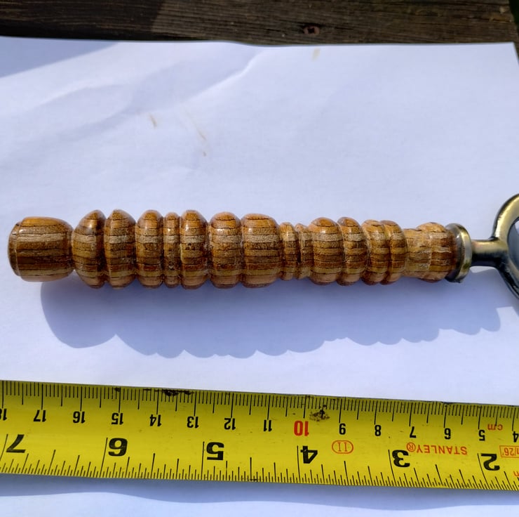 Turned wooden bottle opener with Steel end. When I first got a lathe I enjoyed turning some wood from my garden...I think this is apple or maybe pear, it has a lovely grain and has been lacquered then finished with wax, with the steel bottle opener epoxy resin glued in.... A few different types to choose from, some using plywood, all with different patterns and lengths.