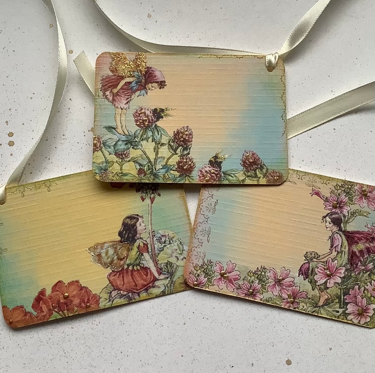 Lovely classic, 'titivated' vintage images of Flower Fairies. I have created and printed these images on to high quality linen-look (285gsm) card . Of course there has to some shimmer! and so I have added the necessary glitter and gilded edges .Finished with lovely ,silky ribbon !!