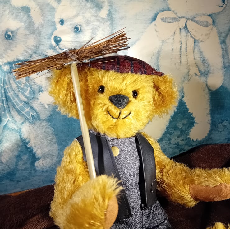 Charlie stands 31cm (12") tall and is hand sewn antique gold mohair. He has an outfit of dungaree and a faux leather waistcoat and cap.