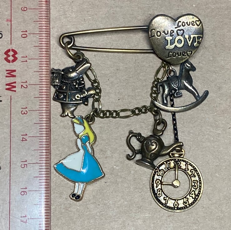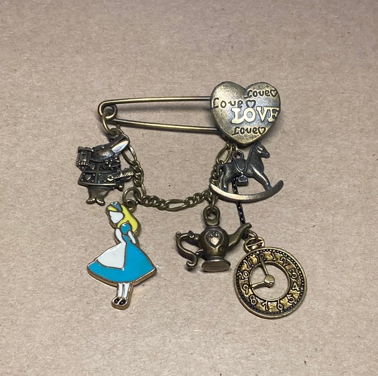 Upcycled Alice in Wonderland Themed Charms Handmade Heart Love Pin - Fun Brooch - Unique Gift - Valentine's Day Gift - Love - Gift