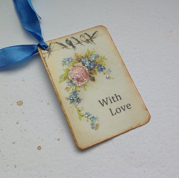 This lovely vintage image features Swallows perched on a wire , and a bouquet of flowers. I have printed this design on to high quality linen -look (255gsm) card then added highlights of glitter . The edges have been inked with sepia ink for a beautiful , aged effect . They are then finished off with lovely ,silky ,vintage -style ribbon !
