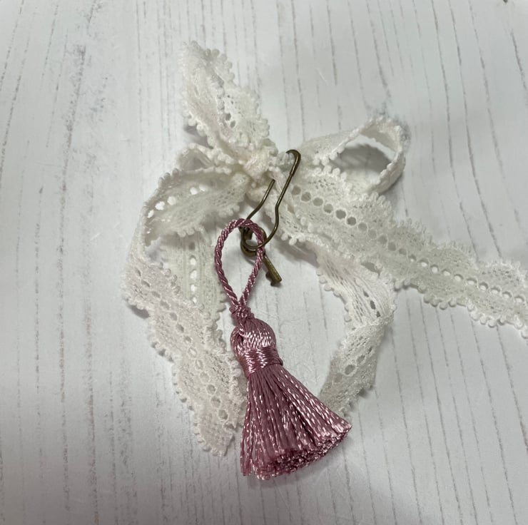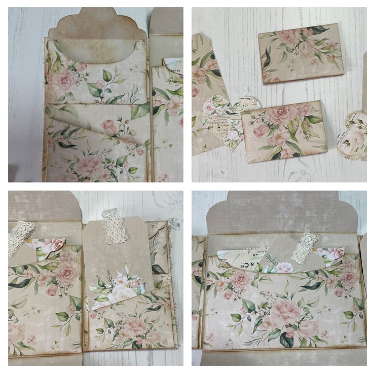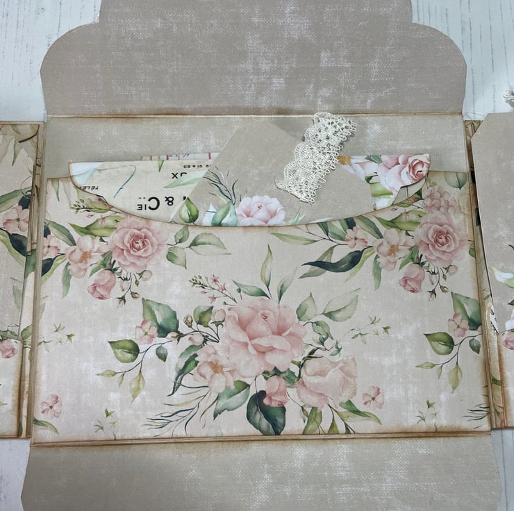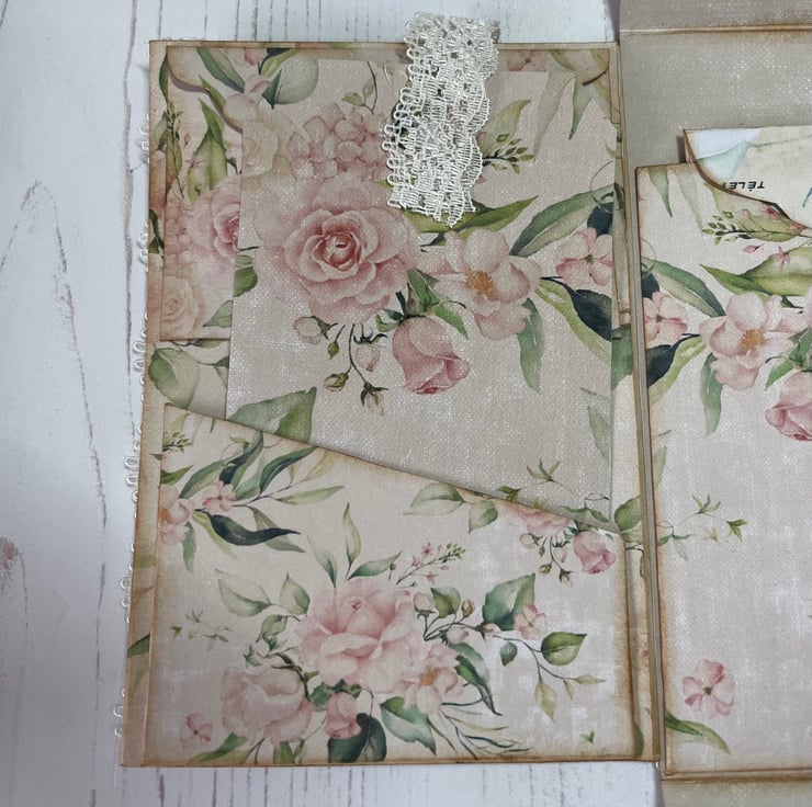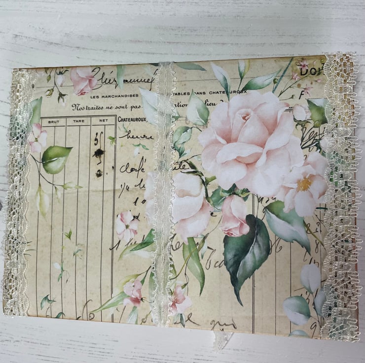 Palest pink roses on a cream background paper, made into a pretty flip folder with envelope pockets, tuck spots. Vintage style ephemera. Lace at the edges and tied together with elastic aged lace, bulb pin with key charm and tassel. Front cover has additional lace with pretty lace appliqué flowers. Measures 5” x 6.5”.