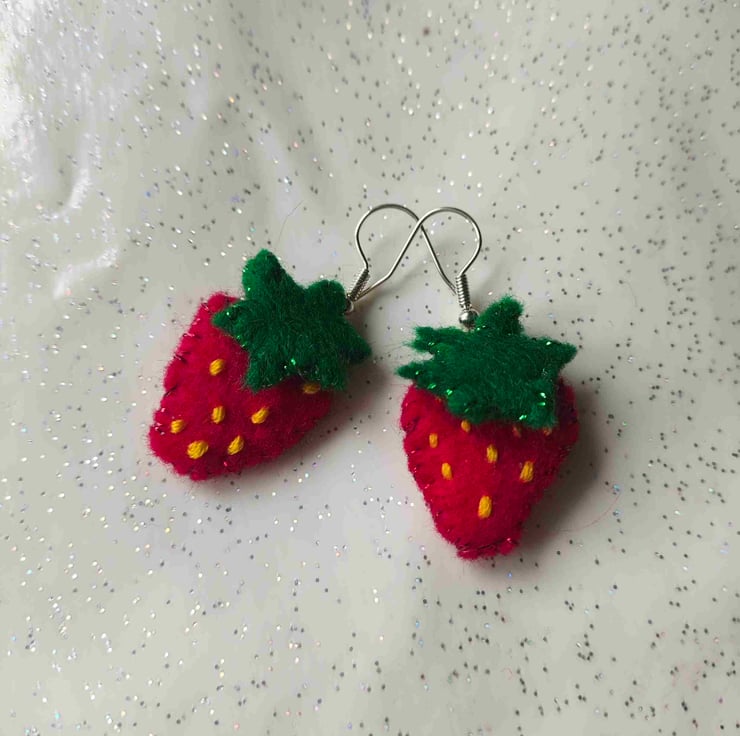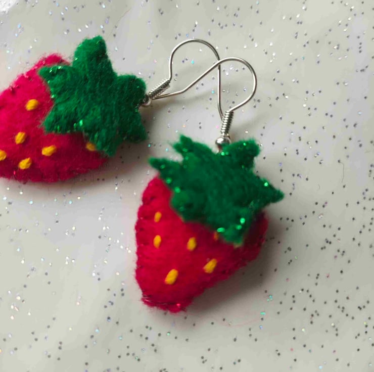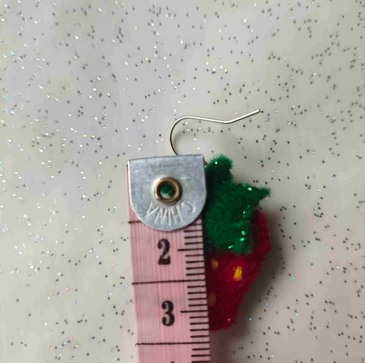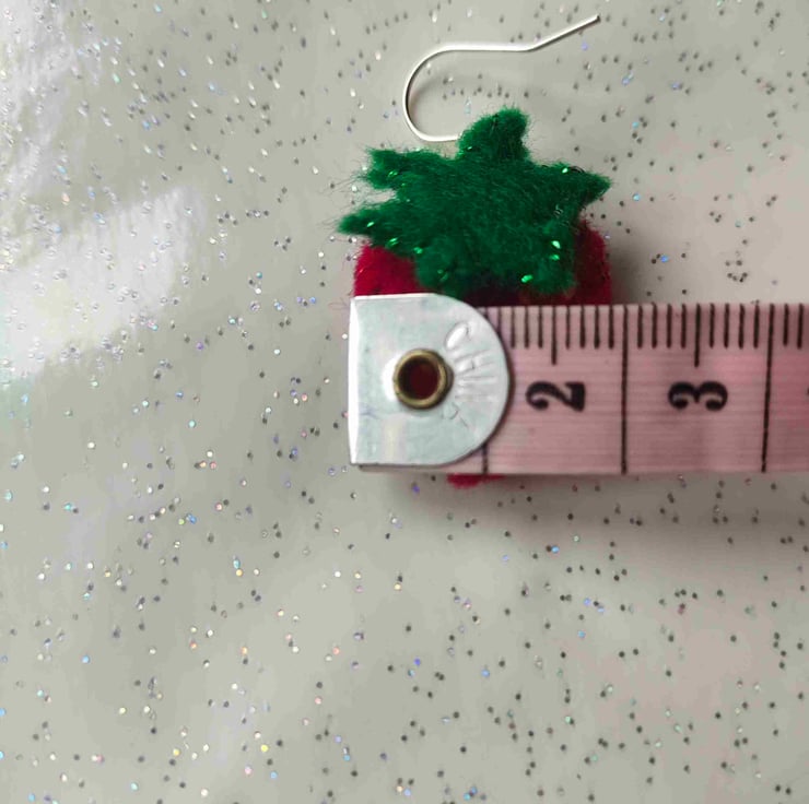 Each strawberry has yellow embroidery seeds and are attached to a silver coloured ear wire, the earrings measure 2cm across and 3.5cm from top to bottom