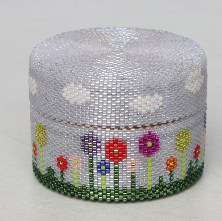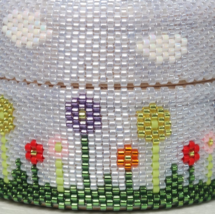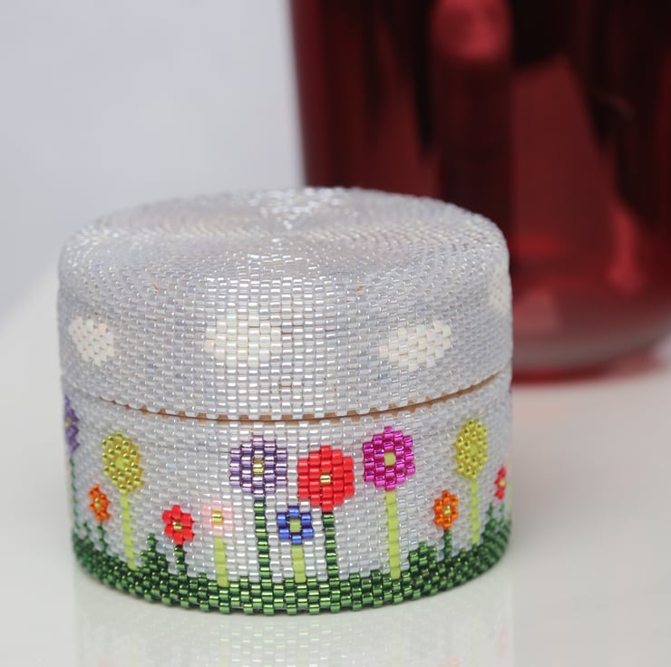The beaded design is my own, stitching together tiny glass beads in a process called beadweaving. I have used a background of very pale blue delica seed beads against which I have incorporated a bright flower design and little white clouds.