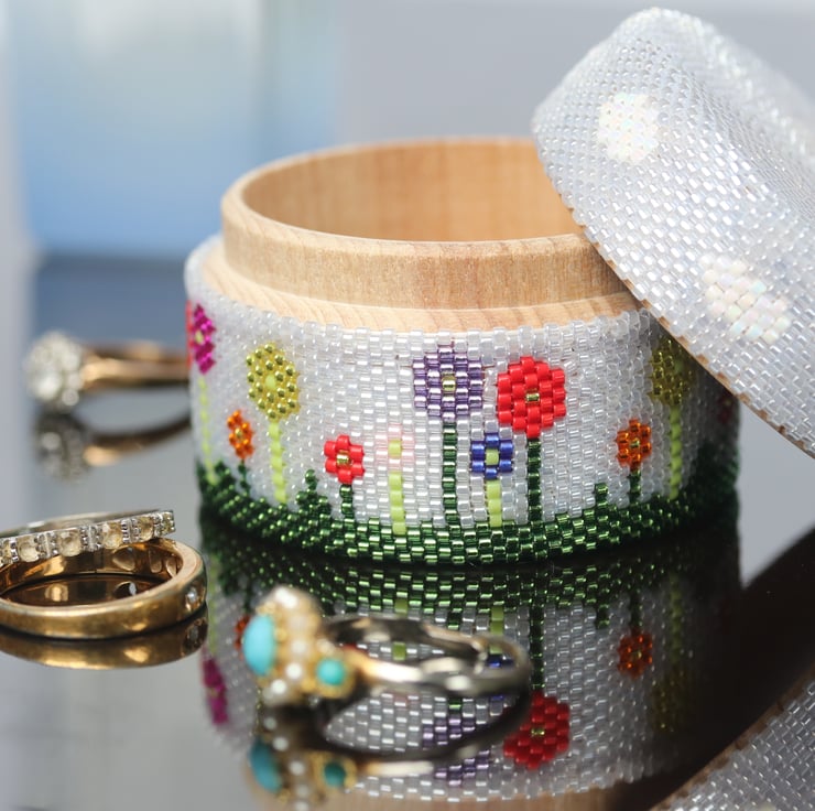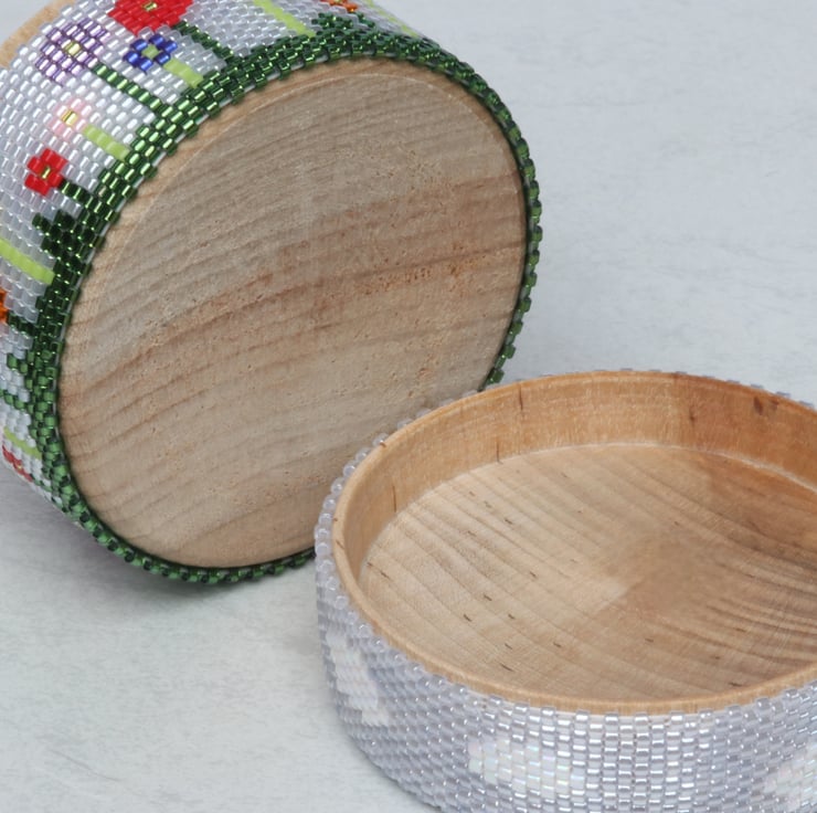 A pretty little wooden pot, decorated with a beaded floral design. Perfect for your dressing table or desk, or as a pretty gift. Please note that the lid only sits loosely on the top, so it would not be suitable for travel or any situation where it might get tipped.