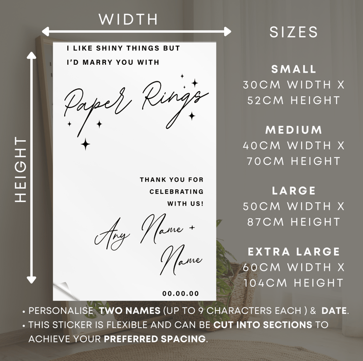 Elevate your wedding décor with our personalised sticker, designed to add a touch of charm and elegance to your DIY signs or mirrors! Available in a range of sizes and colours, this sticker allows you to customise your wedding signage to match your unique style and theme perfectly.