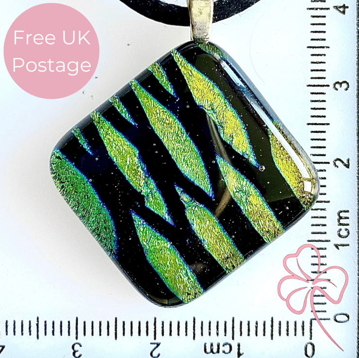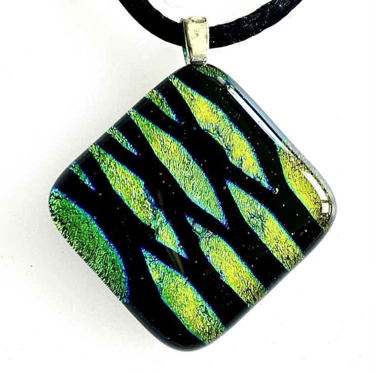 This pendant was made from fusing layers of dichroic and clear glass at 800 degrees Celsius. The shimmering glass shifts from a golden colour to an aqua blue colour in the light. A silver plated jewellery bail was glued on to allow it to be hung as a pendant on a choice of black cord or silver plated snake chain.