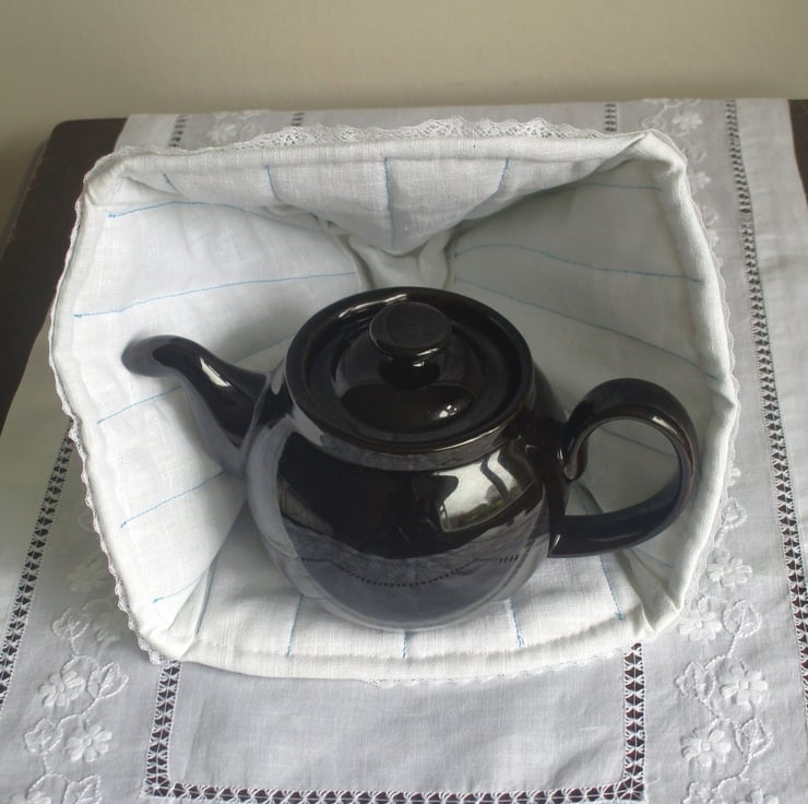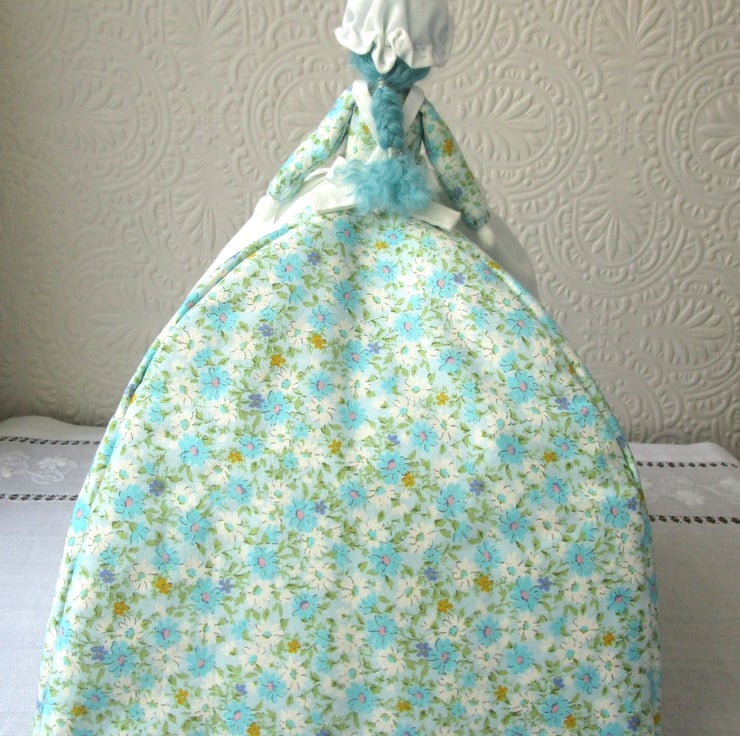 Her dress acts as a Tea cosy, which is made with 4 pieces of fabric, forming a square base, that fits over the teapot. I used 4 layers of textiles, including wadding, to keep your teapot hot for long a time.