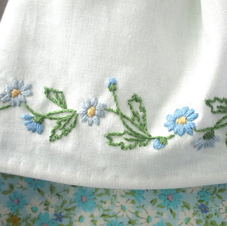 The maid is dressed in a white hat and apron, on which I embroidered daisy that matches her dress. The hat and apron have been sewn on to her body, so they won’t come off.