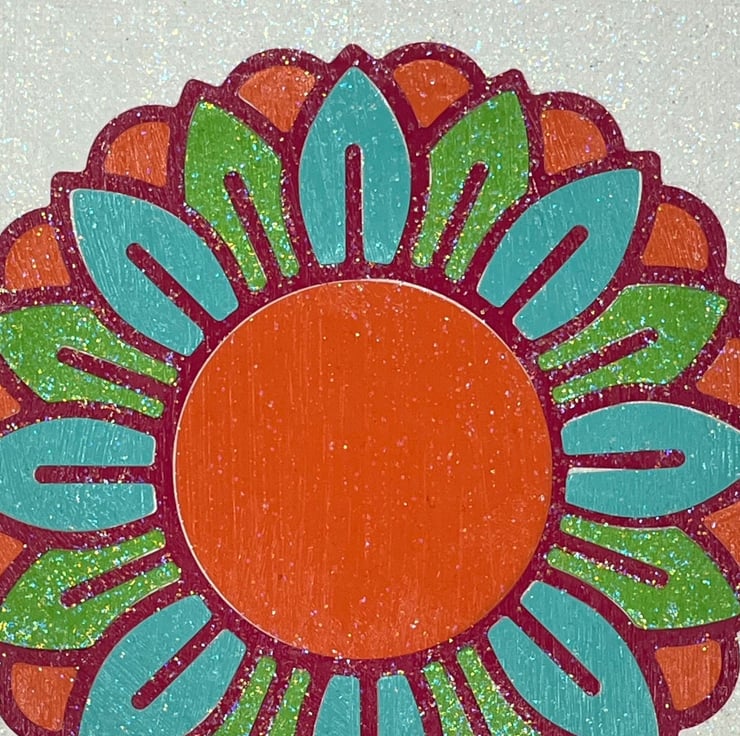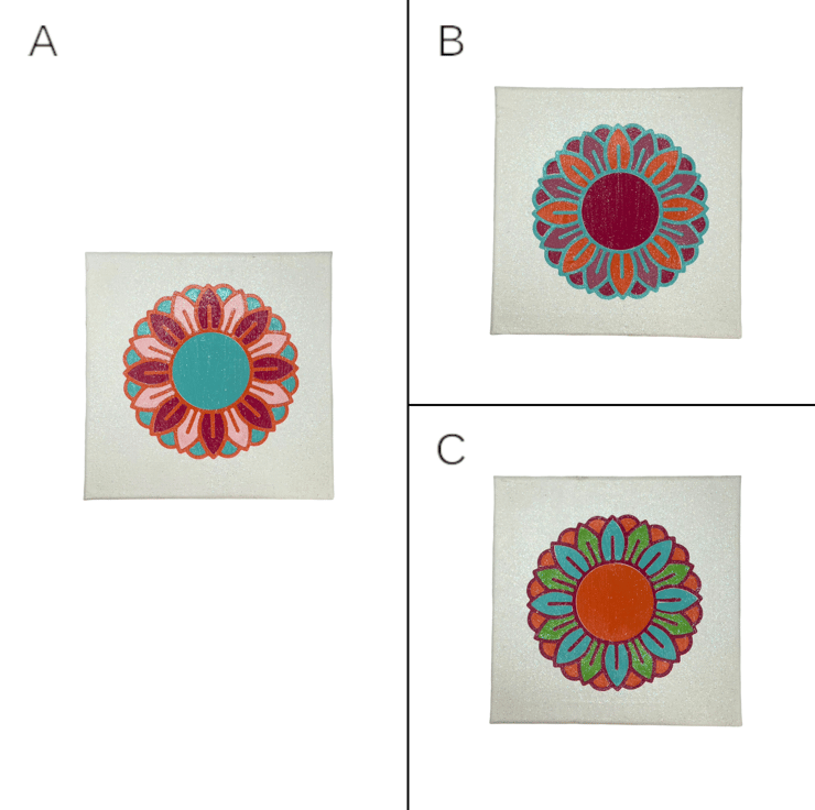Introducing our beautiful wall art featuring three unique designs, each with a different colour scheme. These art pieces are perfect for adding a touch of colour and personality to any room in your home. These canvases have been made using a mix of bright, bold coloured vinyl and paper before being sealed with a glitter top goat.
