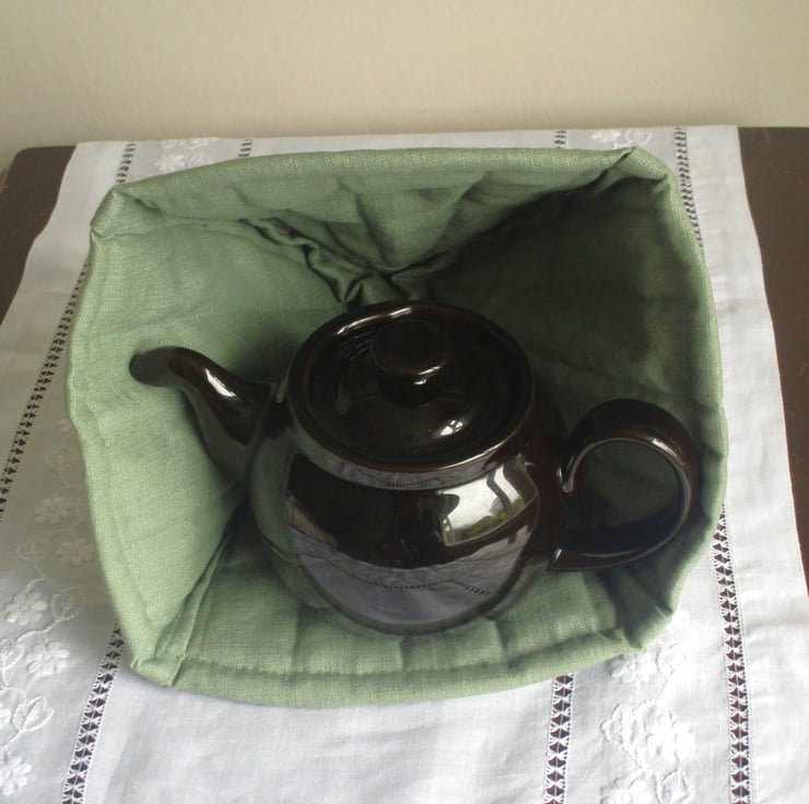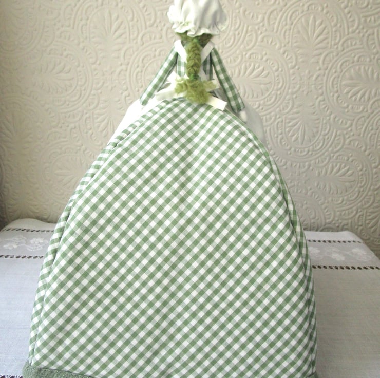Her dress acts as a Tea cosy, which is made with 4 pieces of fabric, forming a square base, that fits over the teapot. I used 4 layers of textiles, including wadding, to keep your teapot hot for long a time.