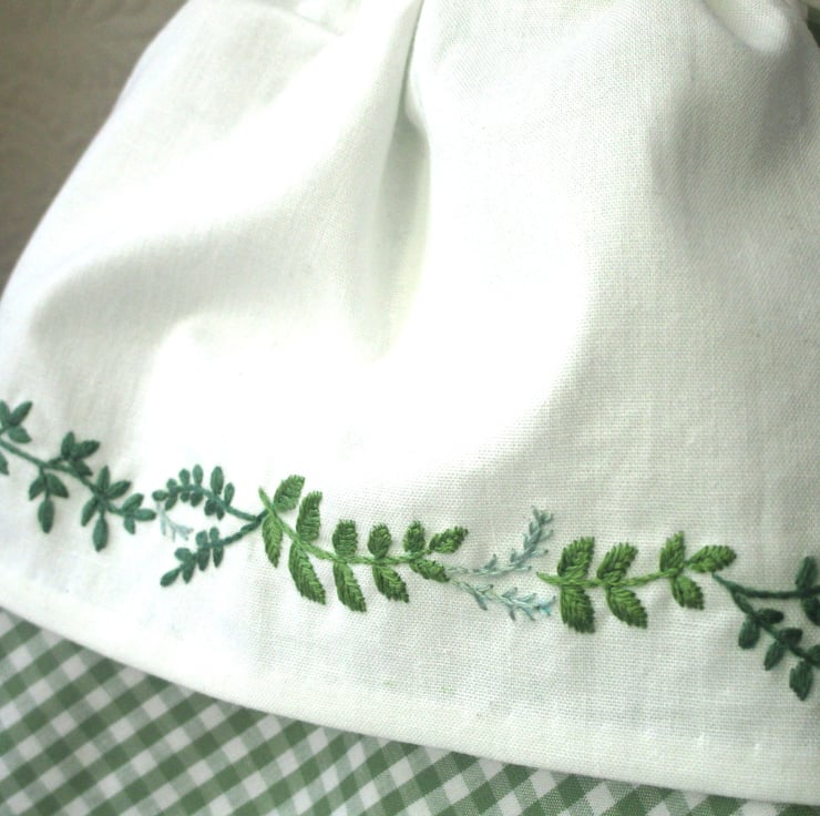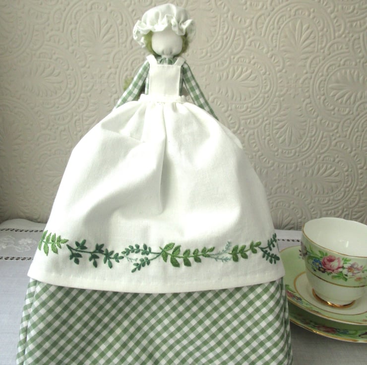 The maid is dressed in a white hat and apron, on which I embroidered leaves that matches her dress. The hat and apron have been sewn on to her body, so they won’t come off.