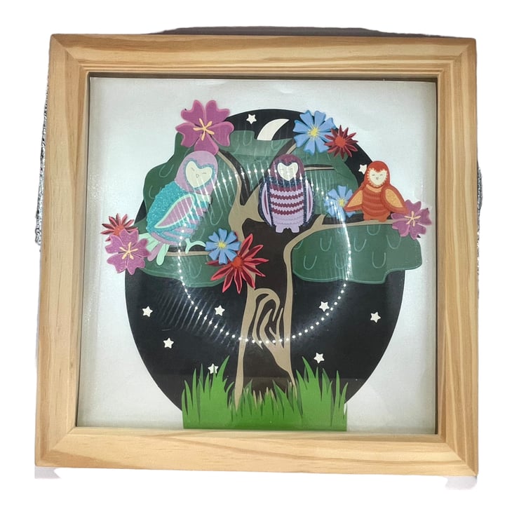 This beautiful wall art features a tree with owls sitting on its branches at night, creating a serene and peaceful scene. The artwork is made of paper and is designed to be displayed in a frame, making it a perfect addition to any room in your home. The intricate details of the owls and the tree create a visually appealing piece that can serve as a focal point or complement other decor in the space. The design has been created by layering up the paper to help achieve a 3D look. This artwork is suitable for any space, such as a living room, bedroom, or office.