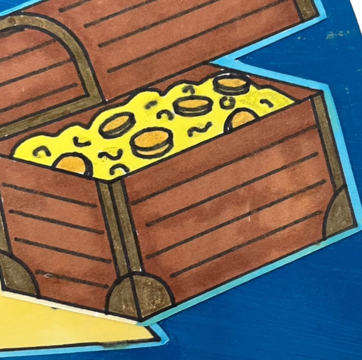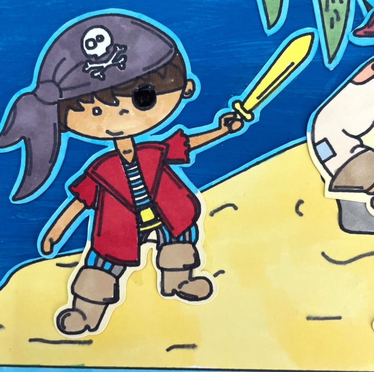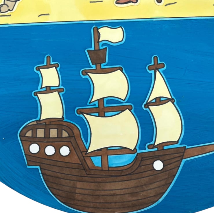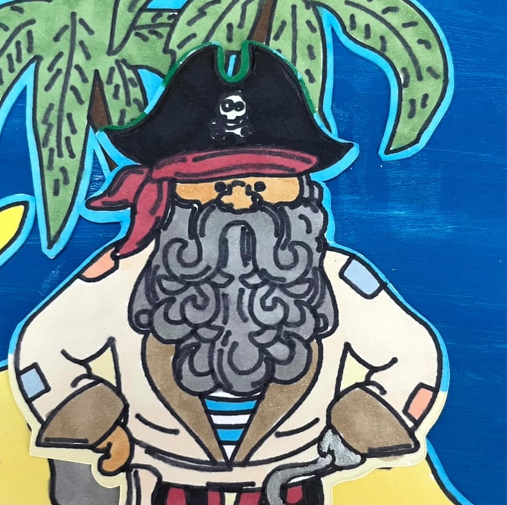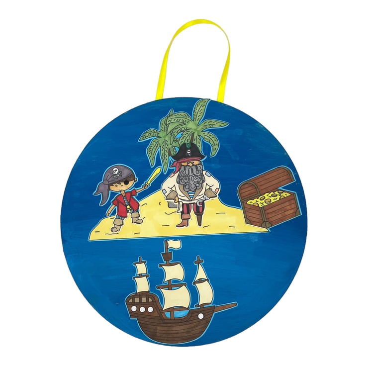 This unique wall art features a pirate ship sailing towards a sandy beach, where two pirates are standing. The artwork is hand coloured and has a whimsical, colourful design that adds a playful touch to any room. The pirate ship and pirates are the focus of the artwork, with the ship occupying a significant portion of the image. The sandy beach and the pirates' presence create a sense of adventure and fun, making it an ideal decoration for children's rooms.