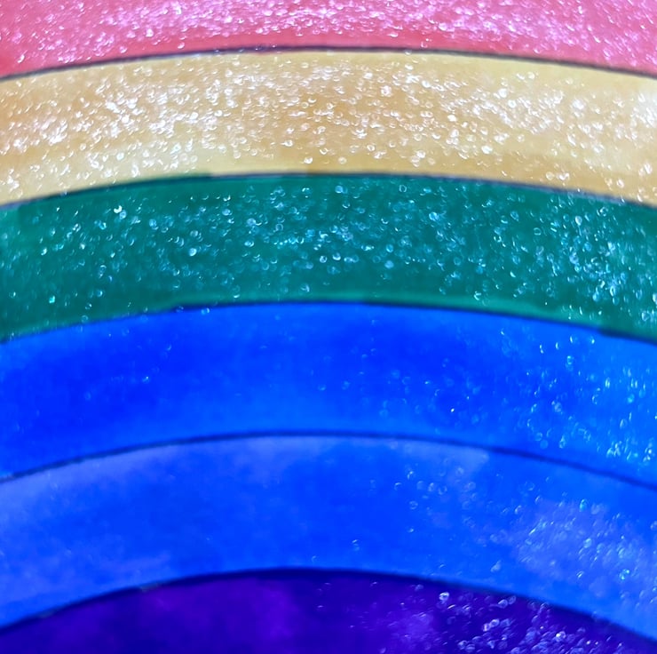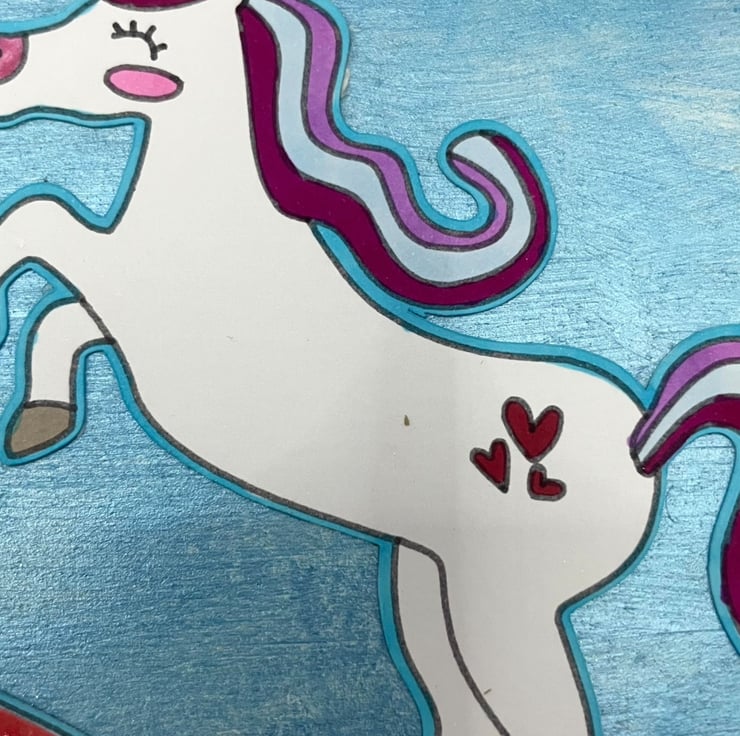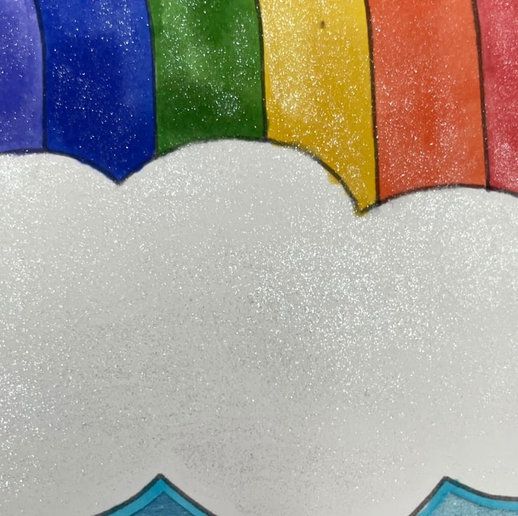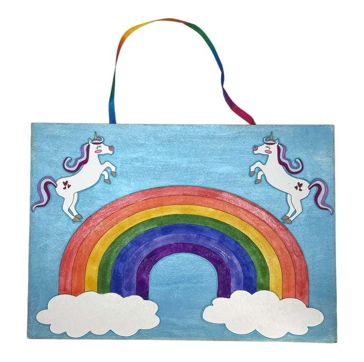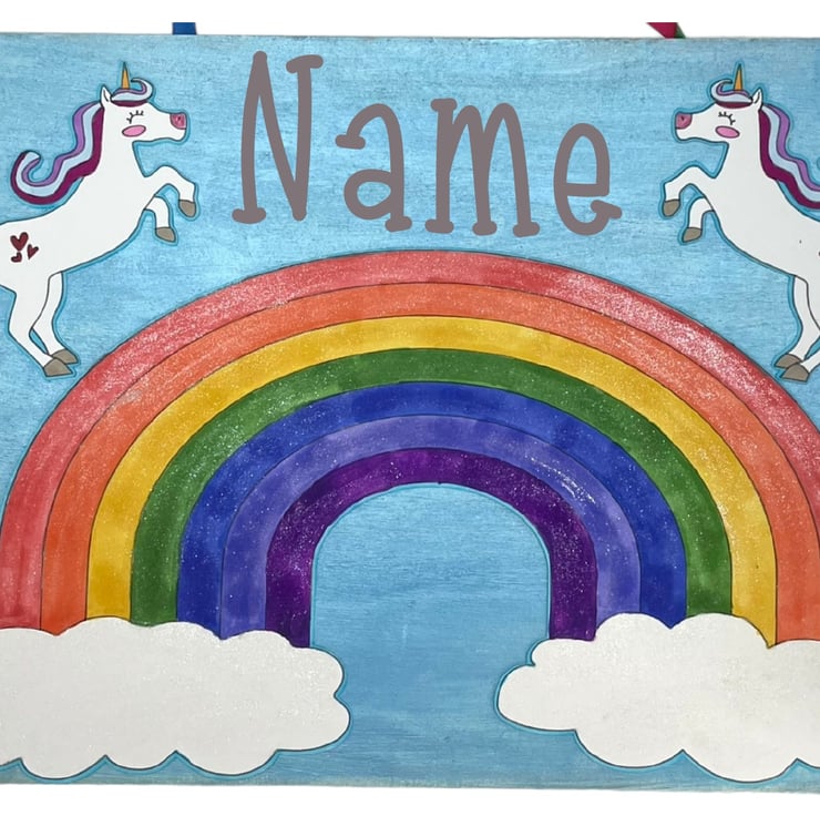 This beautiful wall art features two white unicorns standing on opposite sides of a rainbow, creating a captivating and whimsical scene. The artwork is on a painted shimmery blue background and is adorned with a rainbow and clouds which also sparkle, adding a touch of colour and magic to any room. The unicorns are depicted in a way that makes them appear as if they are jumping over the rainbow with the space in between can have a name added in silver vinyl. This artwork is perfect for adding a touch of fantasy and enchantment to any space, whether it's a child's bedroom, a playroom, or a living room. It can also serve as a unique and creative decoration for parties and events with a fantasy or fairy tale theme.