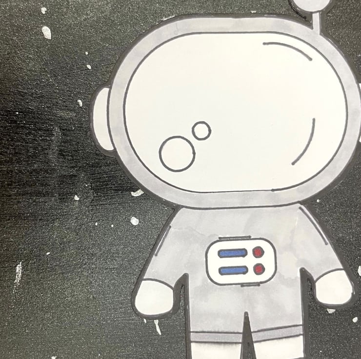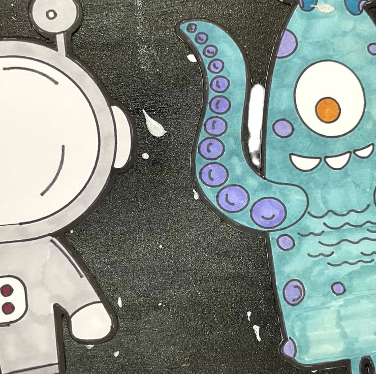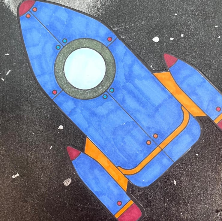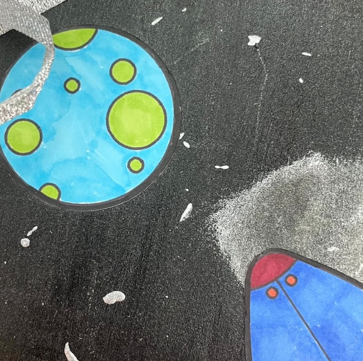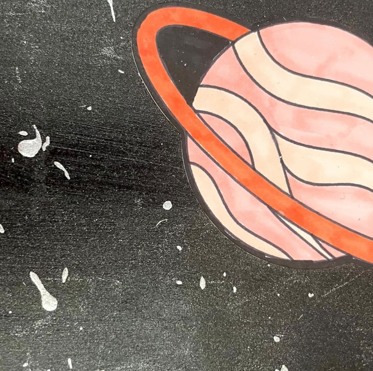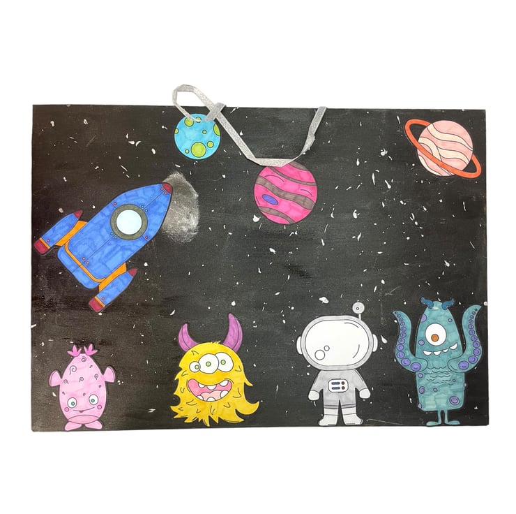 This wall art is a unique and creative way to decorate your space. It features a black background with various colourful planets, spaceships, and aliens, including a rocket ship and a monster. The artwork is not only visually appealing but also adds a touch of whimsy and playfulness to any room. It can be used in a child's bedroom to bring a sense of fun and imagination. The wooden art board has been painted in black and has silver splatters added to look like stars. Each of the images has been hand coloured with bright colours to stand out.