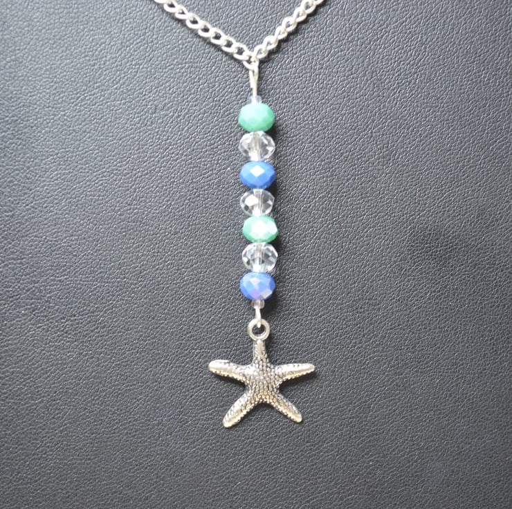Matching necklace and earring set - The necklace is a silver chain which is 19 inches in length and coming down from the center is blue, clear crystal and green faceted rondelles. It's 7 high starting with blue closest to the starfish and alternating blue, clear crystal and green with a silver starfish charm that dangles off the bottom.