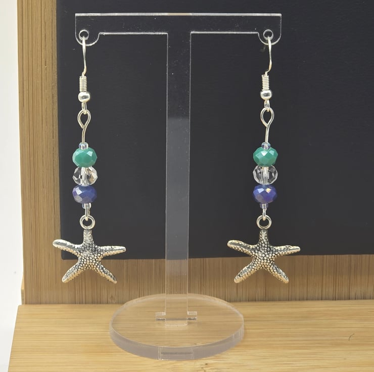 The earrings have been designed to match the necklace they are only 3 beads high, 1 blue, 1 clear crystal and 1 green, with a silver starfish that dangles off the bottom. The hooks are sterling silver and hypoallergenic. They can be changed to clip-on if required please select the option from the drop down menu.