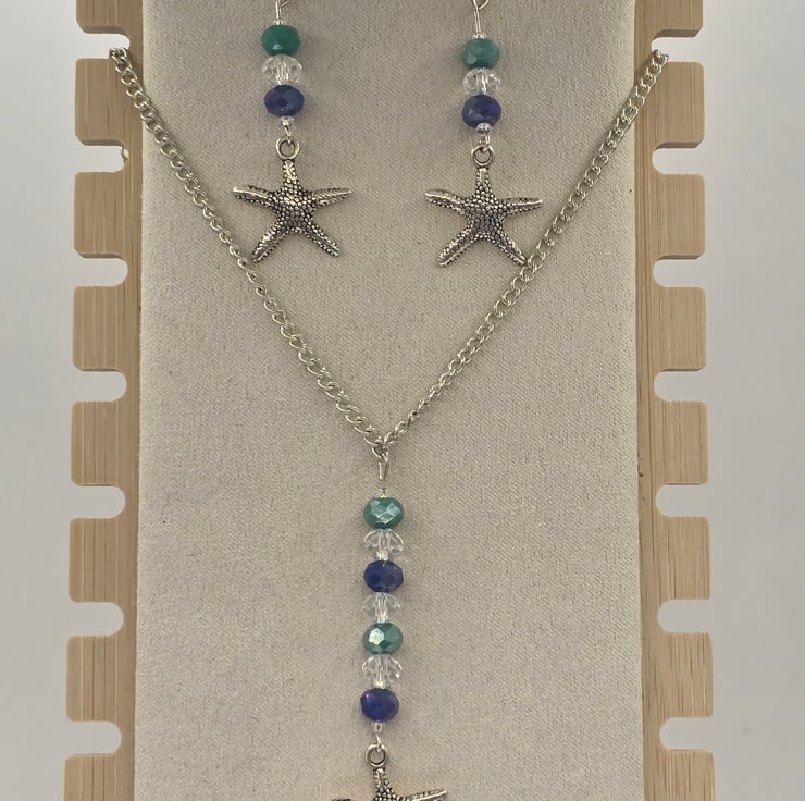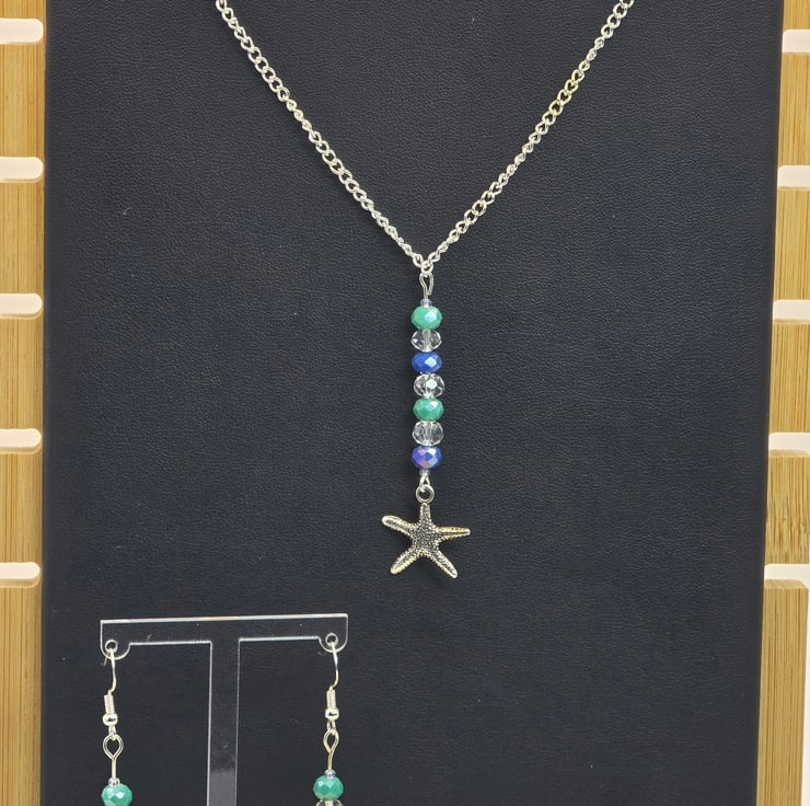 Matching necklace and earring set - The necklace is a silver chain which is 19 inches in length and coming down from the center is blue, clear crystal and green faceted rondelles. It's 7 high starting with blue closest to the starfish and alternating blue, clear crystal and green with a silver starfish charm that dangles off the bottom.
