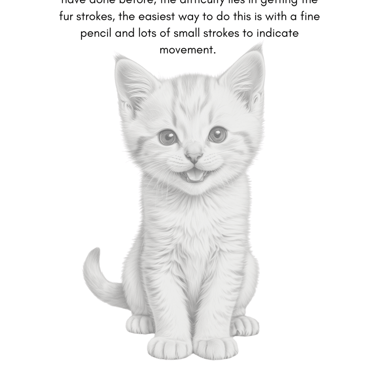 The book contains 70 pages which include 14 black and white pictures of typical pets including kittens, puppies, a hamster, rabbit, goldfish and more. Sketching pages within the book allow for practise.