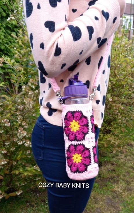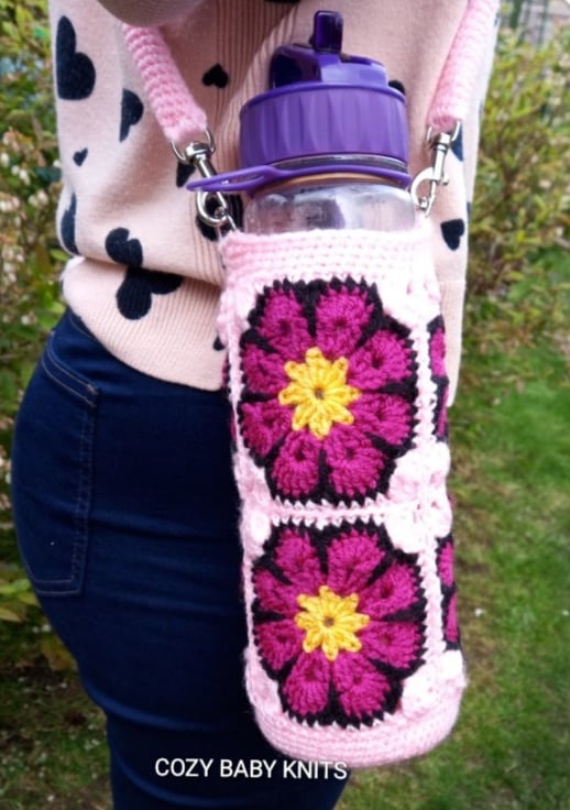 Crossbody bottle bag. Baby pink with plum flowers in granny squares. Made with a removable strap.