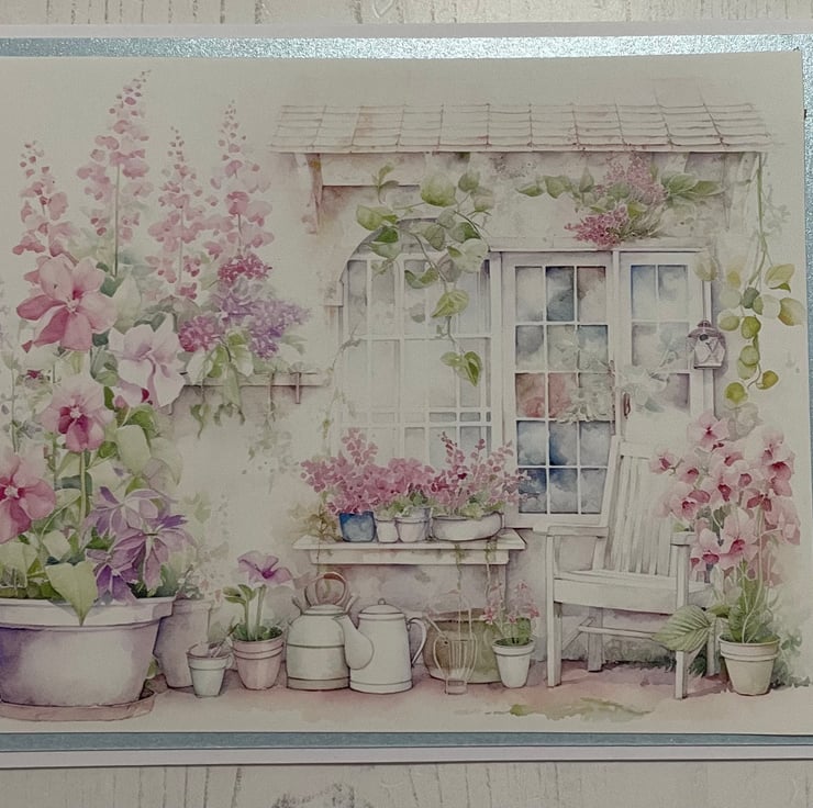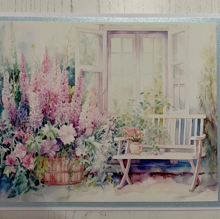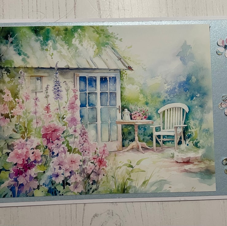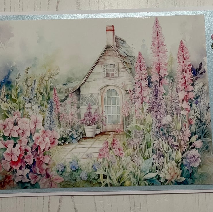 Set of 4 5” x 7” greeting cards, left blank for your own message. White insert. Blue pearl mat, with beautiful image of an enchanted garden. Tiny blossoms with diamanté centres down the side. A useful set of cards for many occasions.