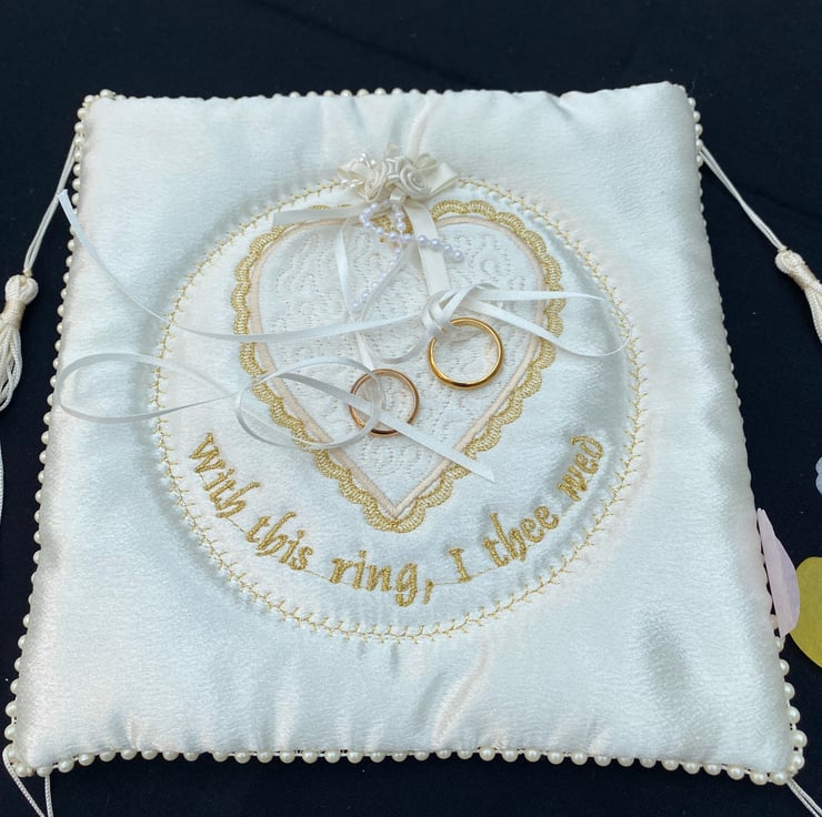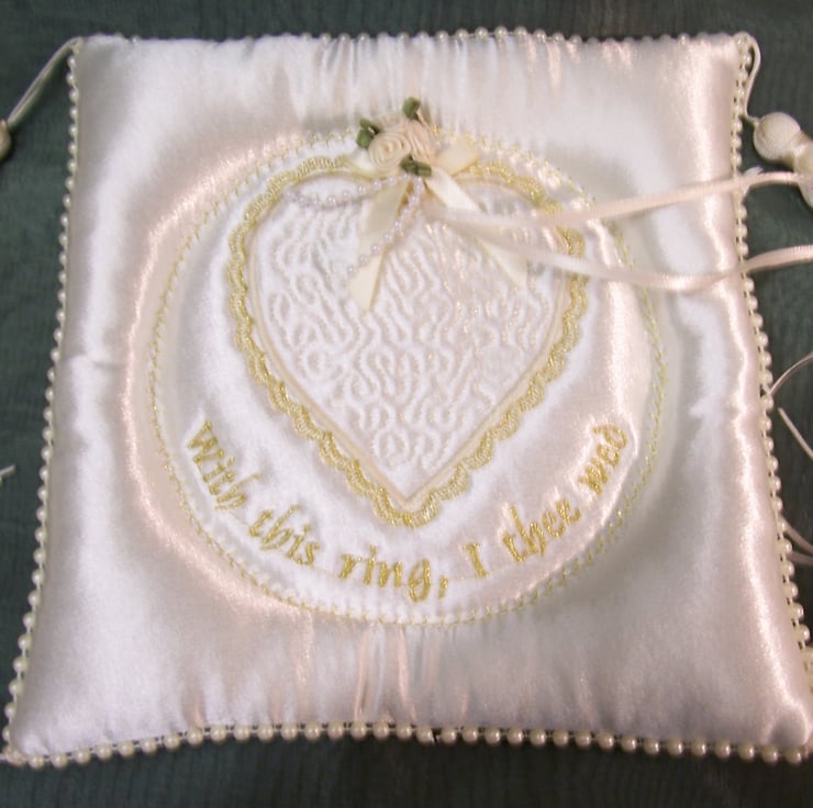I have embroidered the central motif ‘ With This Ring, I Thee Wed ‘ on this ring pillow in gold metallic thread. I then stitched and filled it but left the rest of the decoration to you. You can add more filling if you want a firmer feel, then close the openings, add any embellishments you like to bling it up or play it down. Lace, ribbon, pearls, sequins etc. can be stitched or glued on to suit your way of working. It’s made from crepe-backed satin and measures 7 1/2” square, a nice size for a young ring-bearer. I show a finished pillow in another listing which might give you some ideas and have shown a selection of items you might have in your stash.