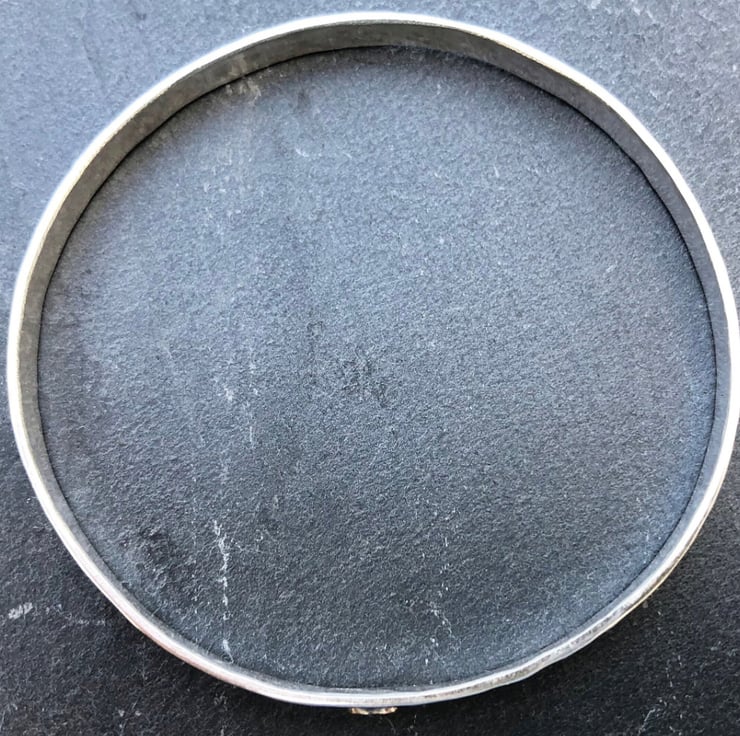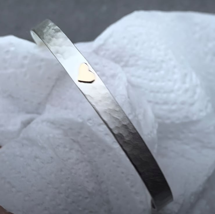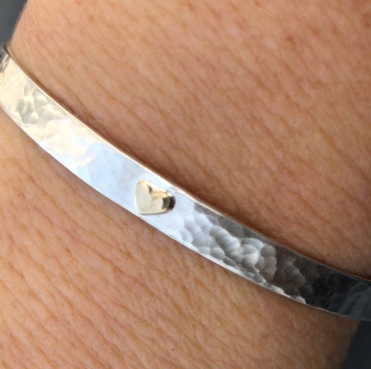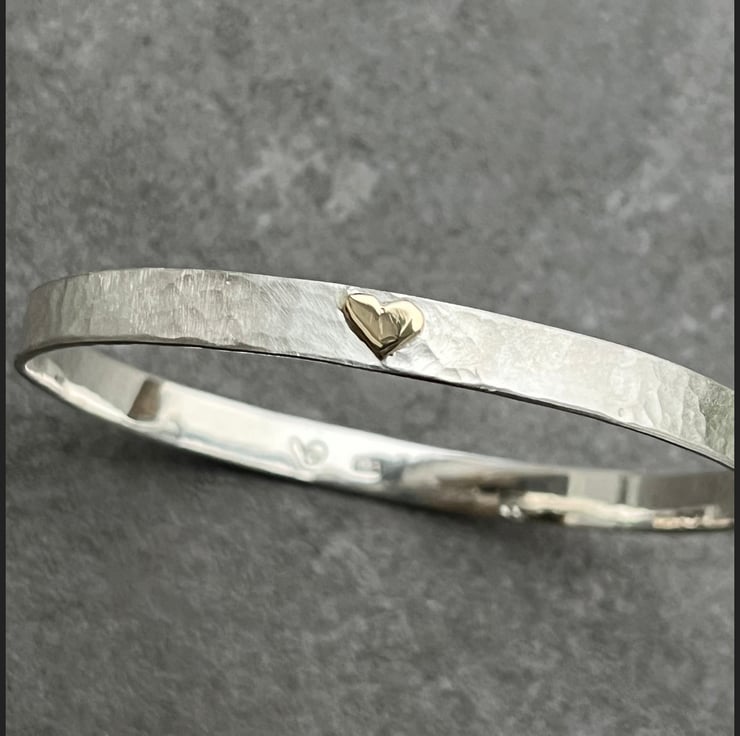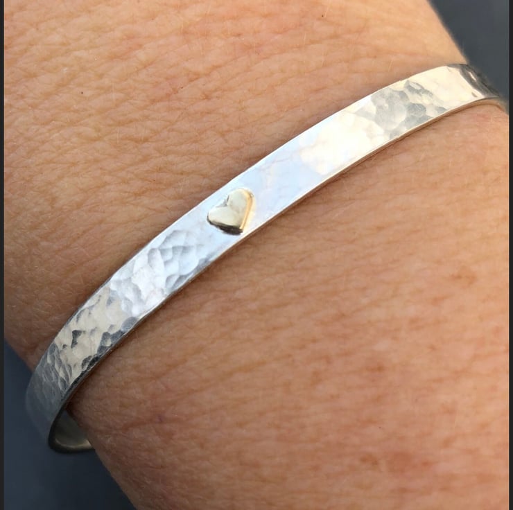 This Gold Heart Bangle has been handcrafted by Michelle using Recycled Sterling Silver and solid 9ct yellow gold. The hammered bangle has a width of approximately: 6mm and is a medium size with an inside diameter of; 6.5cms . If you need it a little larger or smaller please let me know. This bangle has a silver satin finish but if you would prefer shiny finish please let me know.
