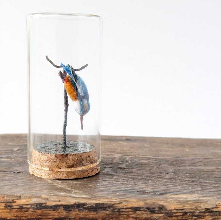 One truly tiny but perfectly formed Kingfisher a quarter of its size in real life (1:4) handmade in wool fiber with mulberry silk details and teeny wire legs.