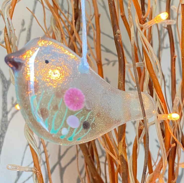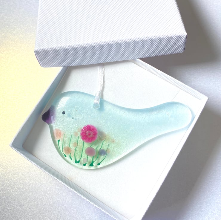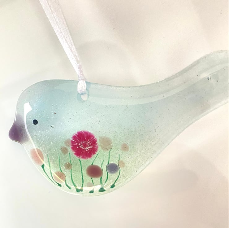 Perfect small gift these pretty floral birds so with a by room . They can be hind both inside or outside as the glass is bounce thickness . Containing pretty pink murine flowers , drilled and strung with ribbon - ready to hang . Approximately 4 inch diameter .