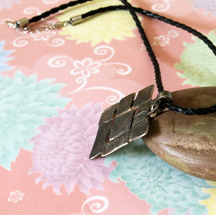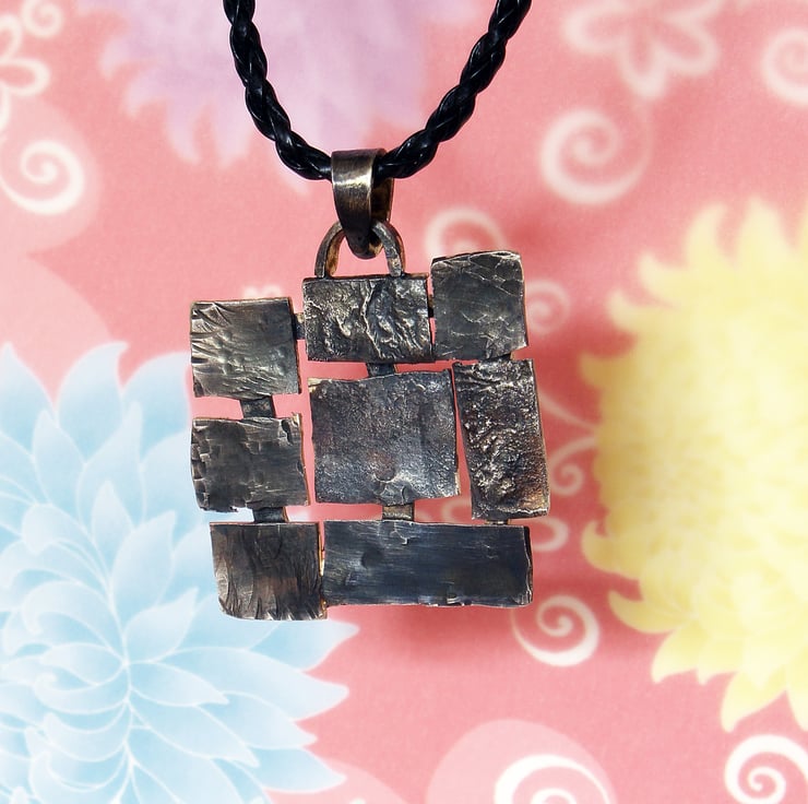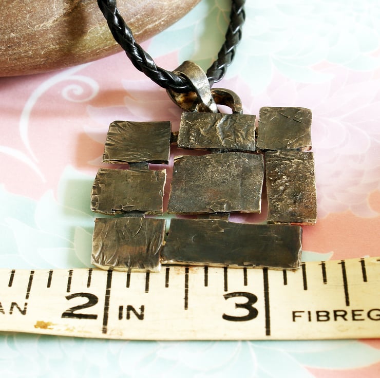 The pendant is approx. 1.5"(4 cm) square, and hangs 2"(5 cm) down from the loop. It is on a suede thong 19"(46 cm) long. It has been polished, smoothed and finished to a high professional standard and is a fascinating example of modern artisan silver-work.