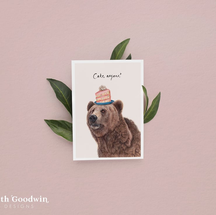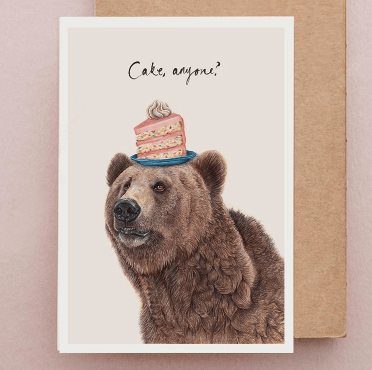 A sweet hand illustrated Grizzly Bear card that's perfect for and animal lover. The design was originally hand-drawn in coloured pencils, giving it that extra special touch. Featuring the text 'Cake, anyone?'