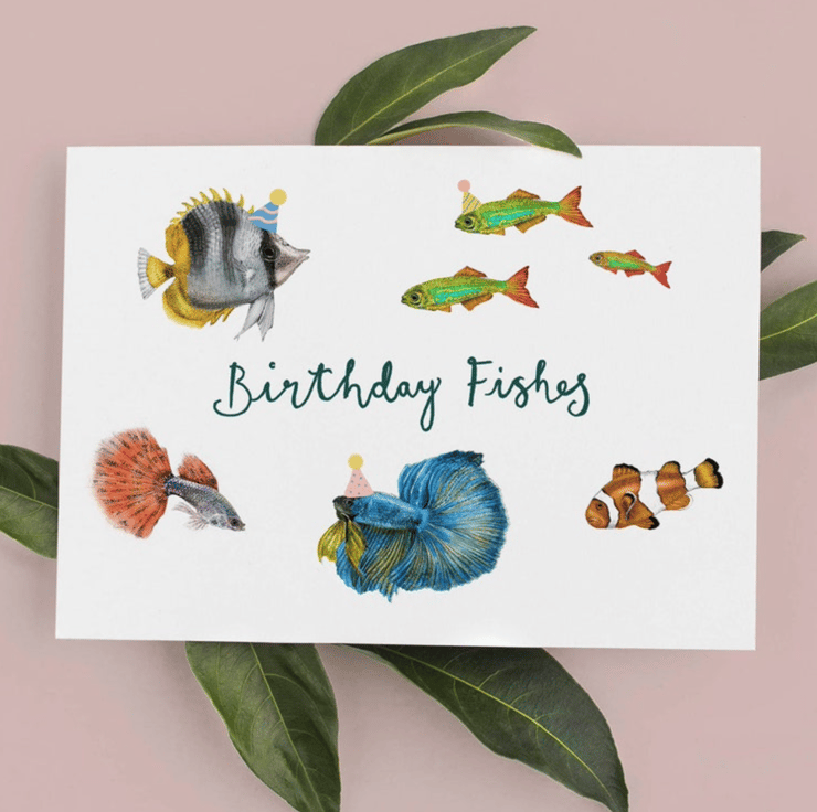 This bright and colourful hand illustrated greetings card is perfect for Fish fans. Featuring lots of tropical fish wearing party hats.