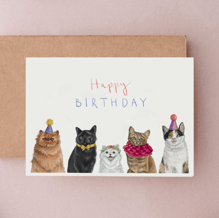 A hand illustrated birthday card great for all cat lovers. Featuring a row of party cats and kittens wearing their finest party attire, ready for the celebrations.