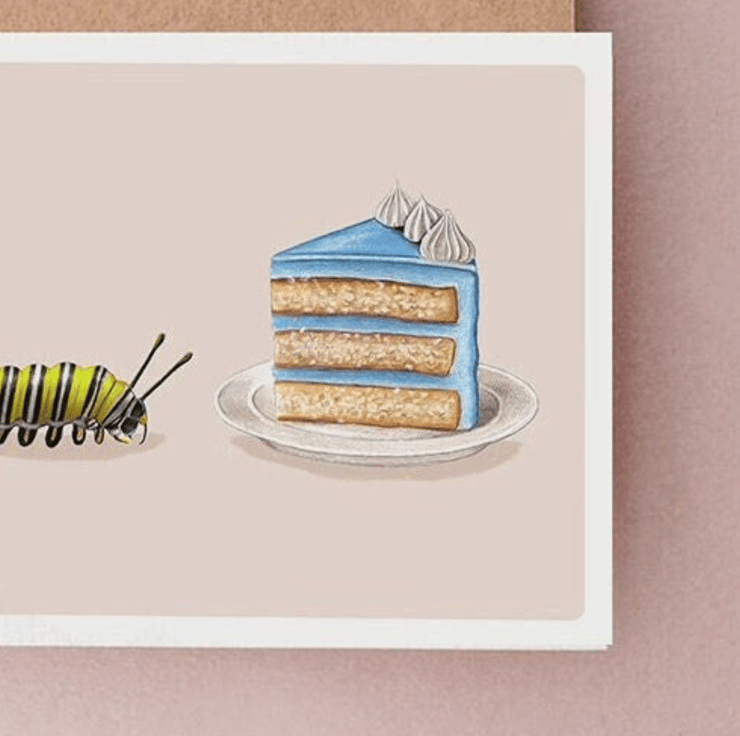 A hand drawn illustration of a Caterpillar cake! A card that is perfect for retro cake fans.