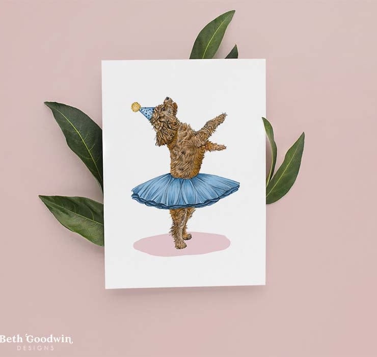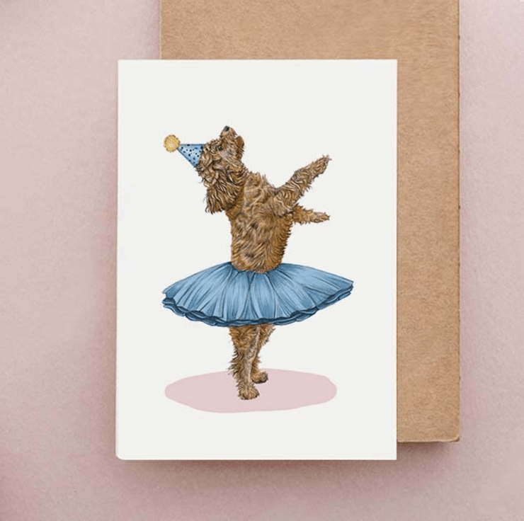 A bright and colourful hand illustrated greetings card perfect for dog lovers. Featuring a dancing Cockapoo wearing a tutu.