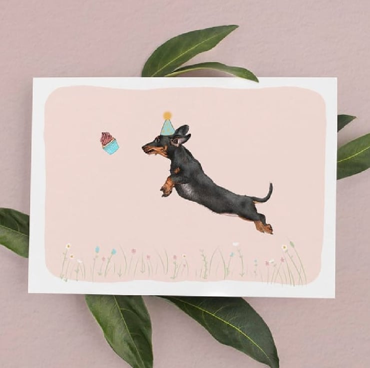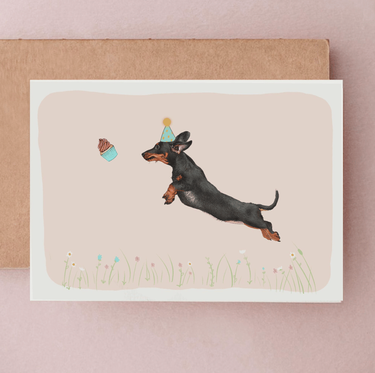 This colourful bright birthday card is great for Dachshund lovers. Featuring an illustration of a leaping black and tan Sausage Dog over a pastel pink background.
