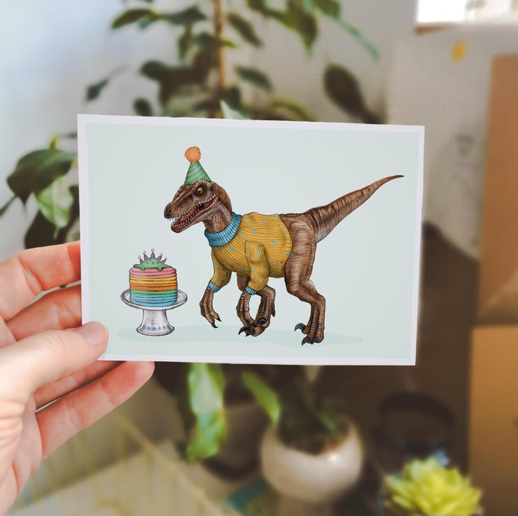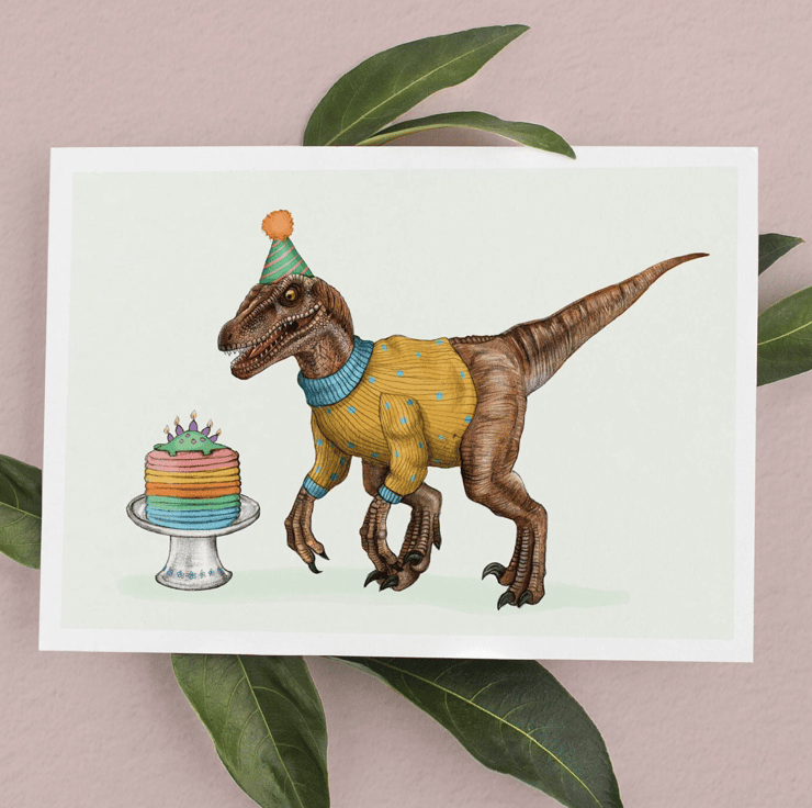 Just because I know everyone loves a Dinosaur wearing a jumper, here is a hand illustrated Raptor waiting to dig into his Rainbow birthday cake. The perfect card for dinosaurs lovers.