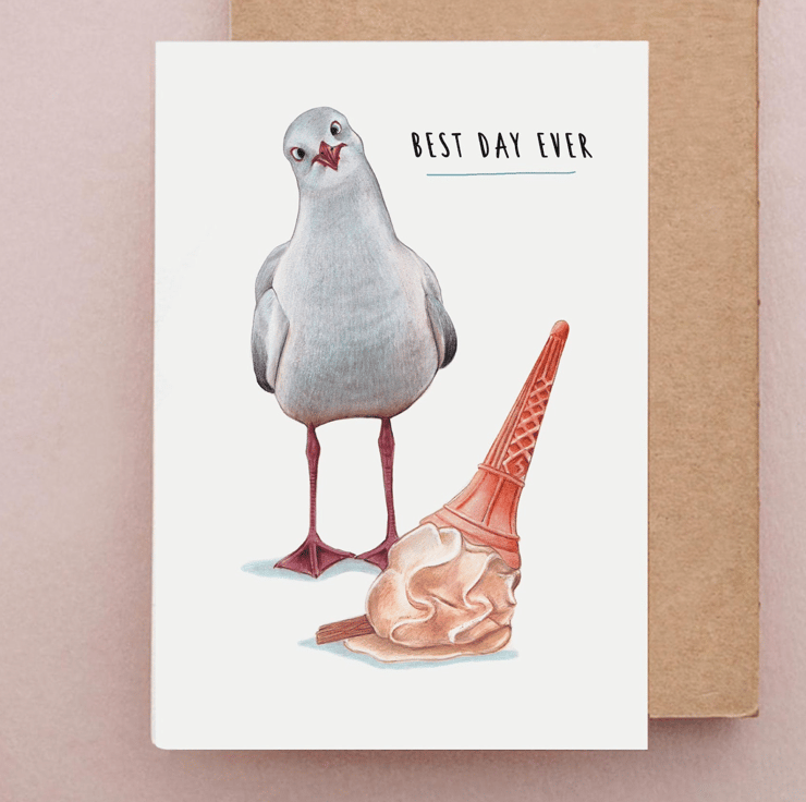 A funny Seagull card featuring a hand drawn Gull whose found a dropped ice cream. Perfect for so many celebrations!