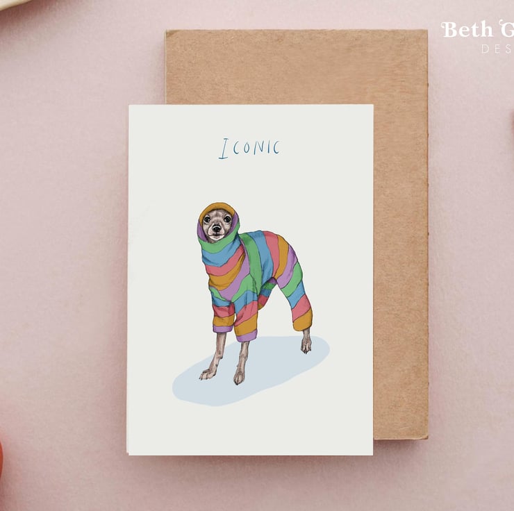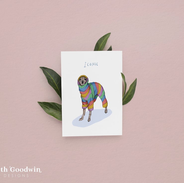A card featuring a cute little Italian Greyhound card perfect for fans of these funny little creatures. Featuring a hand drawn Iggy wearing a rainbow onesie.