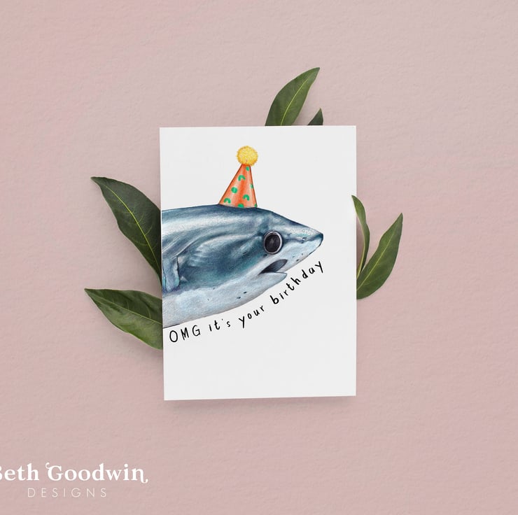 This funny Shark card is perfect for any Thresher Shark fans. Featuring a surprised little Shark wearing a colourful party hat.