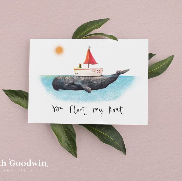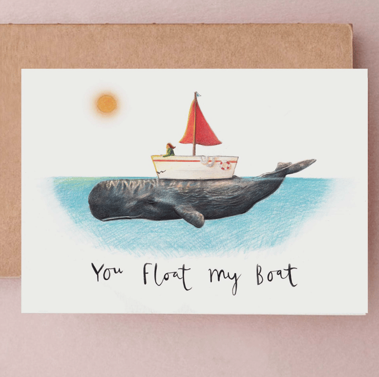 A sweet and romantic card for ocean lovers. Featuring a completely hand-drawn design of a Sperm Whale holding up a ladies broken sailboat. Perfect for Valentines Day and anniversaries.