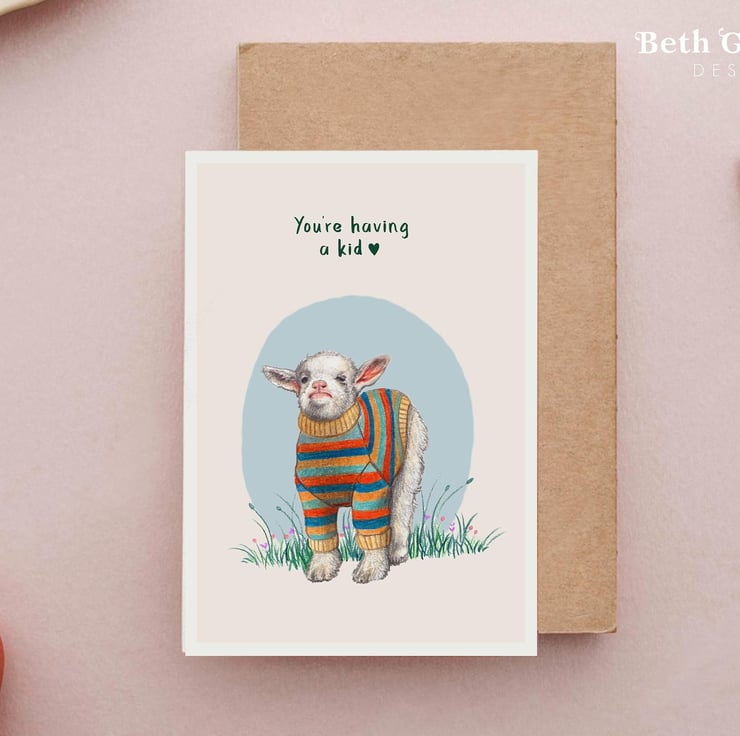 The perfect greetings card for expectant parents, this sweet baby goat (kid) was drawn by hand.