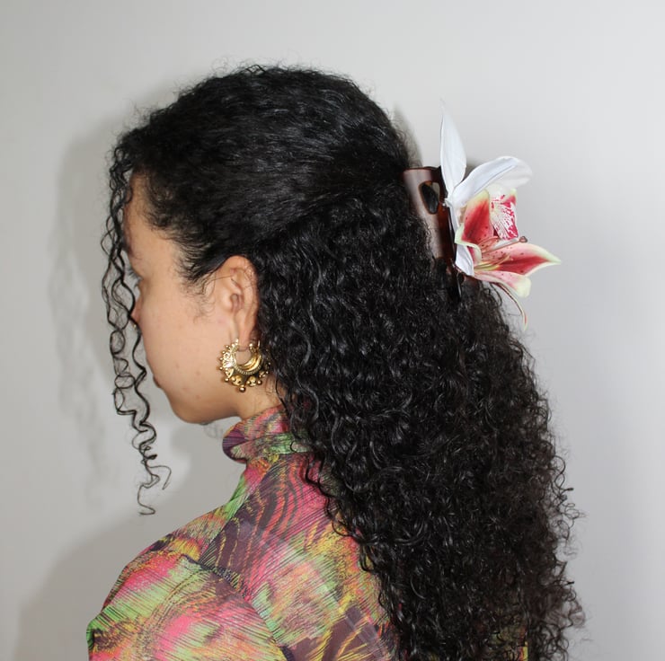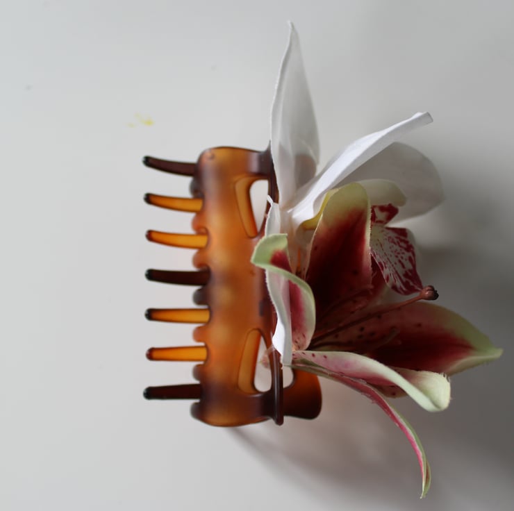 -The positioning of the flowers on the claw clip creates some restriction with how far it can open. Therefore it is recommended to wear in styles that are half up or sectioned. Additionally, you can place it on top of a hair tie.