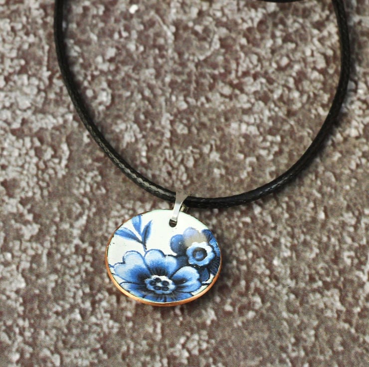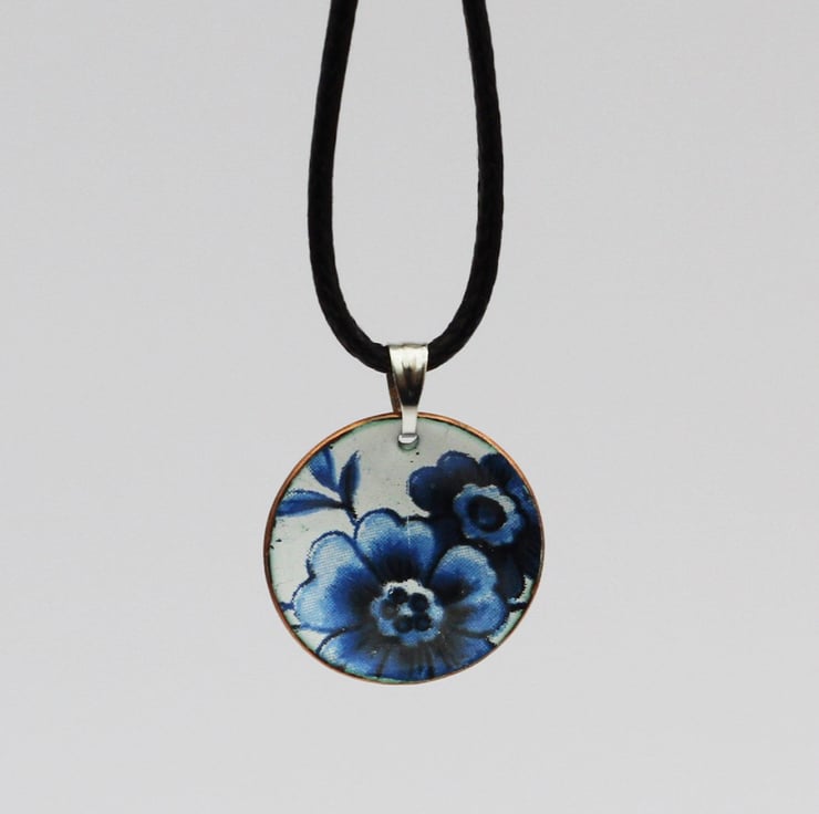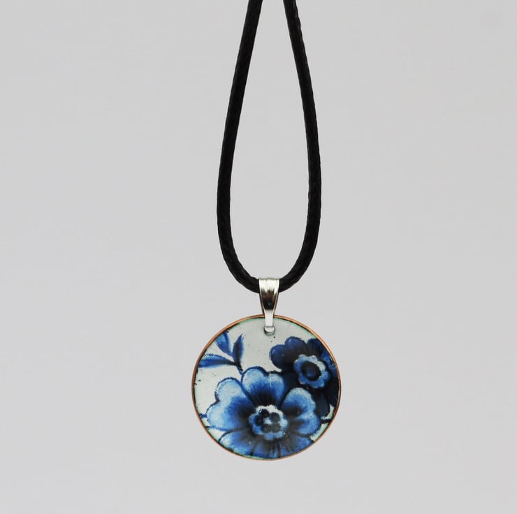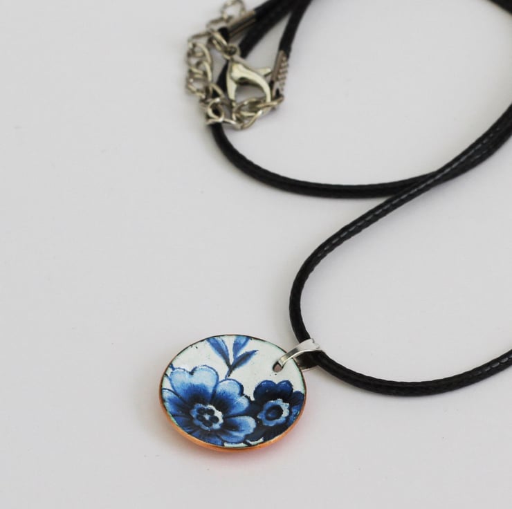 Enamelled copper pendant with a blue floral design on a white background. It is suspended from a 45cm (18 inch) black waxed cotton cord