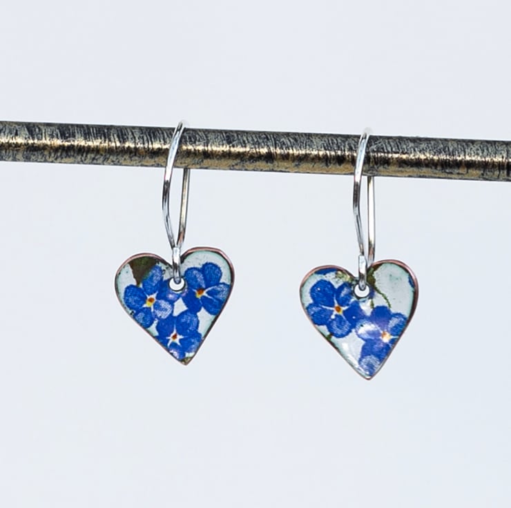Enamelled copper heart shaped earrings, decorated with forget-me-nots on a white background. Each heart is slightly concave and has a natural copper finish on the back. The earring wires are handmade from sterling silver