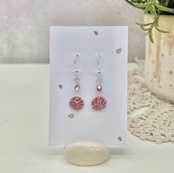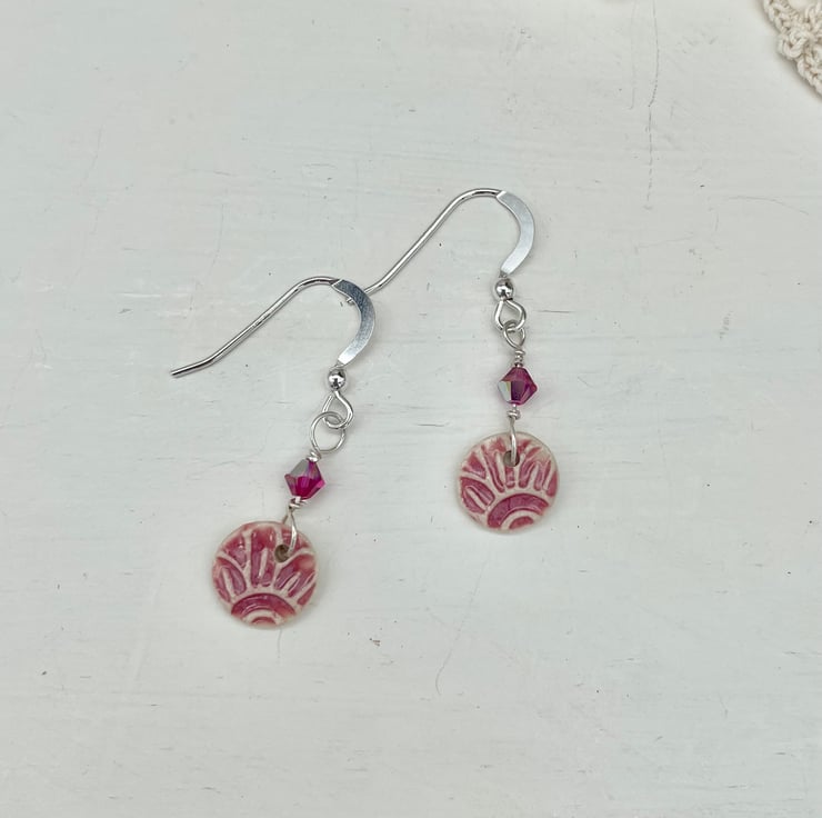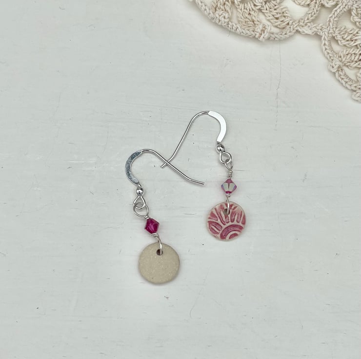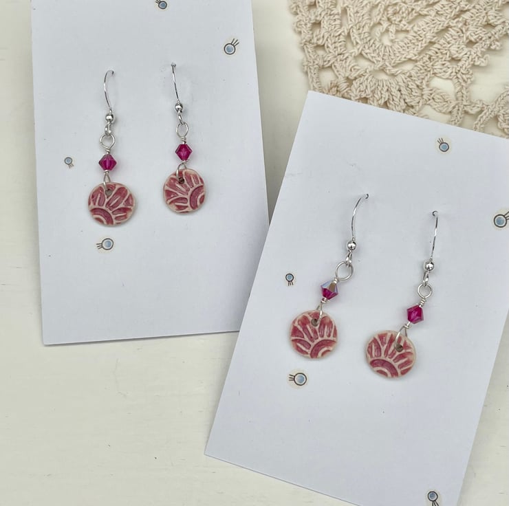 The earrings have sterling silver (please see Note below) ear wires with a pink Swarovski crystal bead (to add sparkle) on wrapped sterling silver wire, under which hangs clay disk which I’ve imprinted with the centre of my abstract flower stamp before glazing in pink to add texture. The reverse is unglazed.