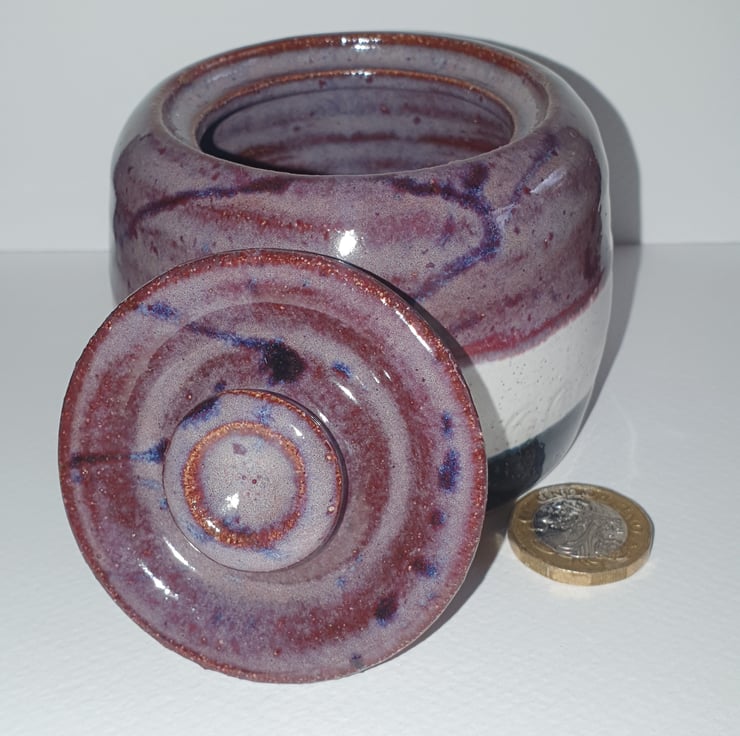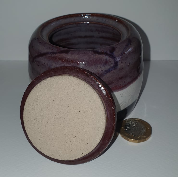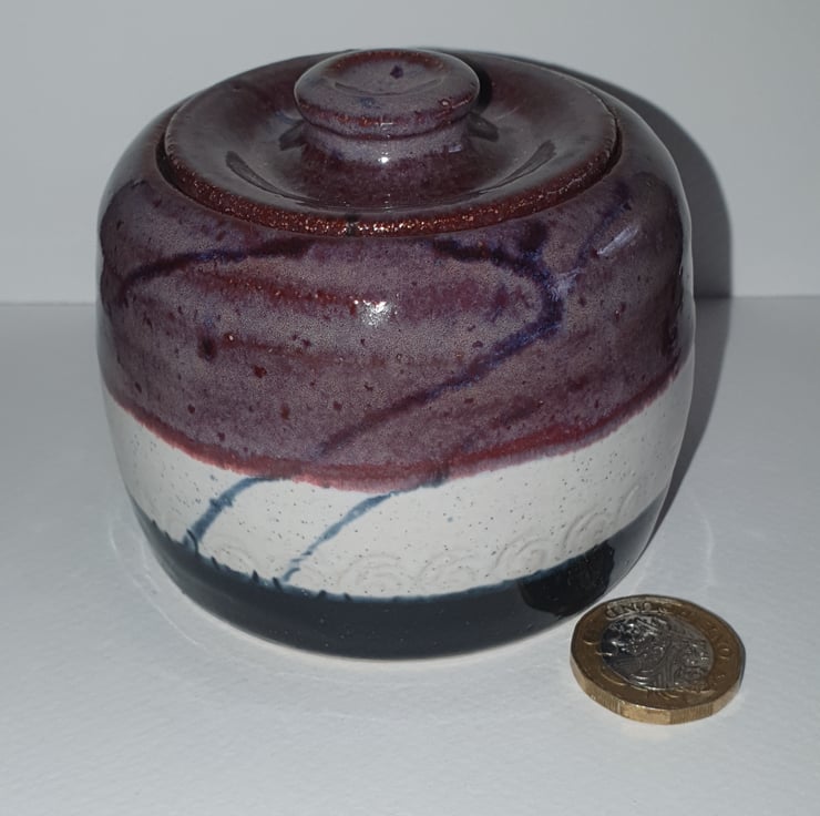Sugar bowl. Trinket pot. Wheel thrown.stoneware. Glazed in smokey merlot, oatmeal and obsidian. Imprinted circle pattern around body of pot.