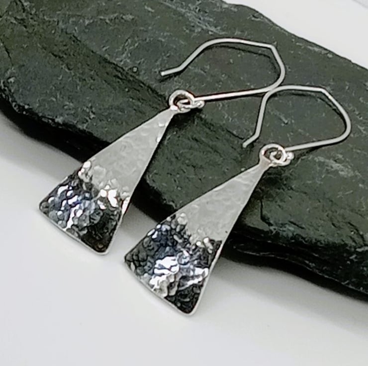 These handmade sterling silver Leagan Earrings have been hand cut from recycled sterling silver sheet, the shape is an elongated triangle measuring 3.7 cm long by 1.8 cm at the widest, they have a slight inward curve along the length and are finished to a high shine, they have a hammered texture finish which gives a wonderful bounce back of light as they move freely.